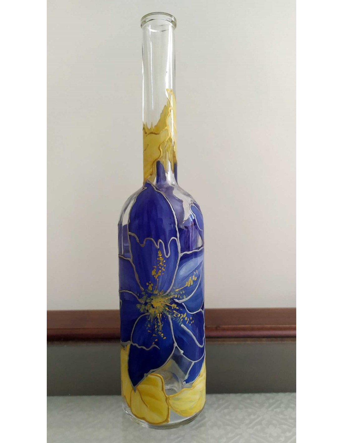 Bottiglia in vetro dipinta a mano con fiori blu e foglie oro, con leggero rilievo della pittura.