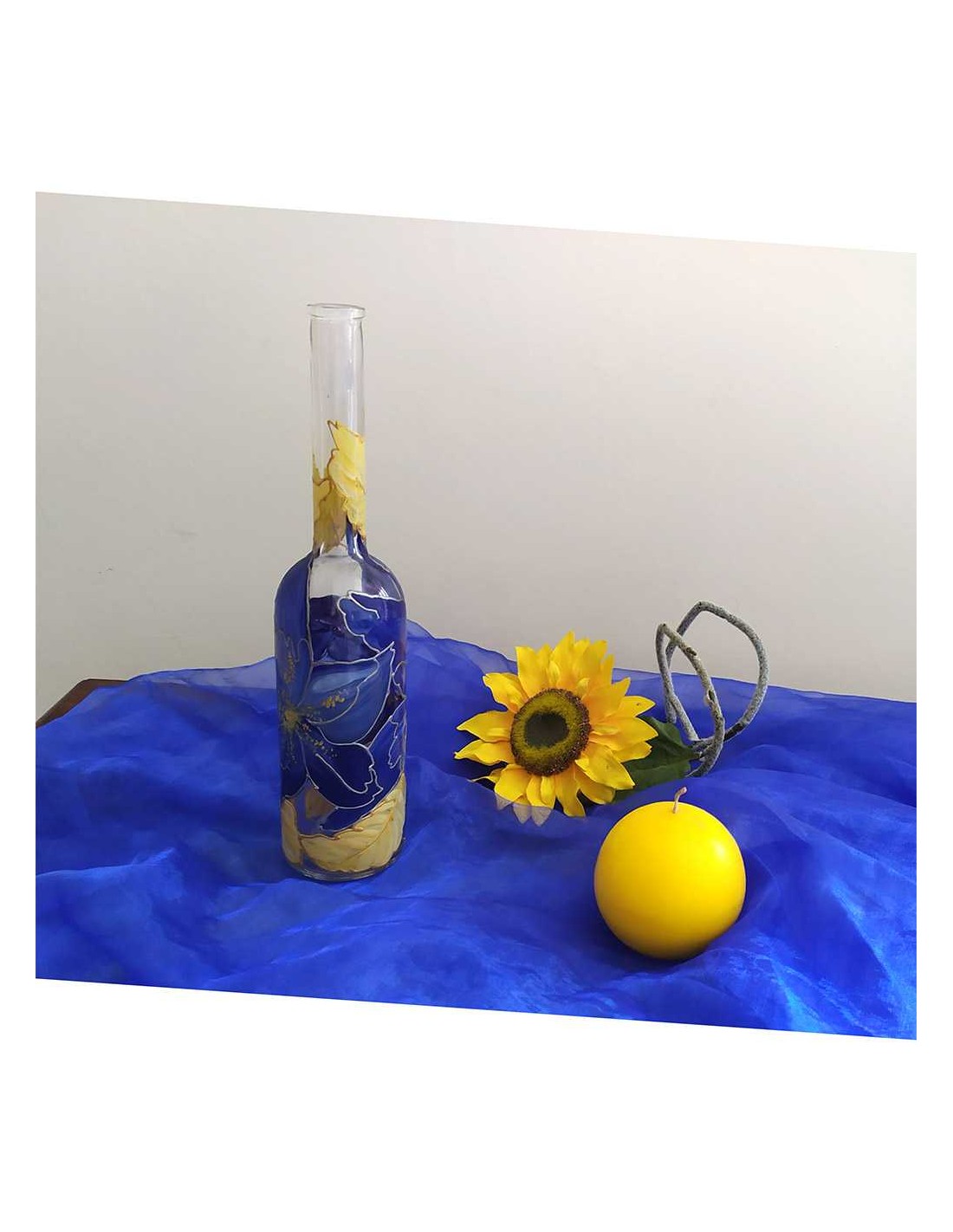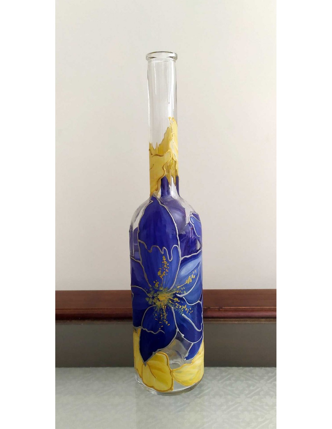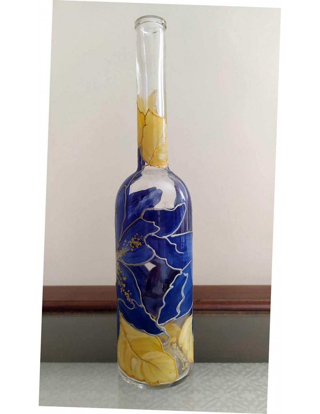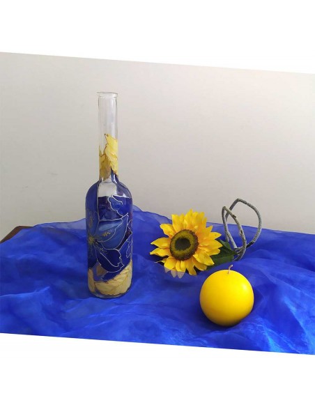 Bottiglia in vetro dipinta a mano con fiori blu e foglie oro