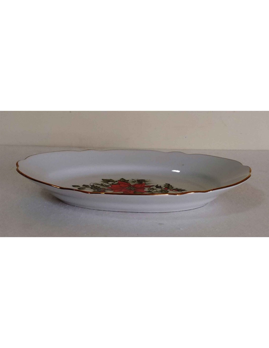 Elegante vassoio Natalizio in Porcellana – Atmosfera e Tradizione a Tavola. Aggiungi un tocco di magia ai tuoi momenti di relax durante le feste con questo splendido vassoio. Realizzato in pregiata porcellana bianca, il vassoio si distingue per il suo classico decoro natalizio con Stelle di Natale (Poinsettia), agrifoglio e pigne, il vassoio è arricchito da un raffinato bordo rifinito in oro. Vassoio dalla forma ovale e bordi ondulati rifiniti iin oro, perfetto per servire il caffè direttamente in tavola o come elemento decorativo.