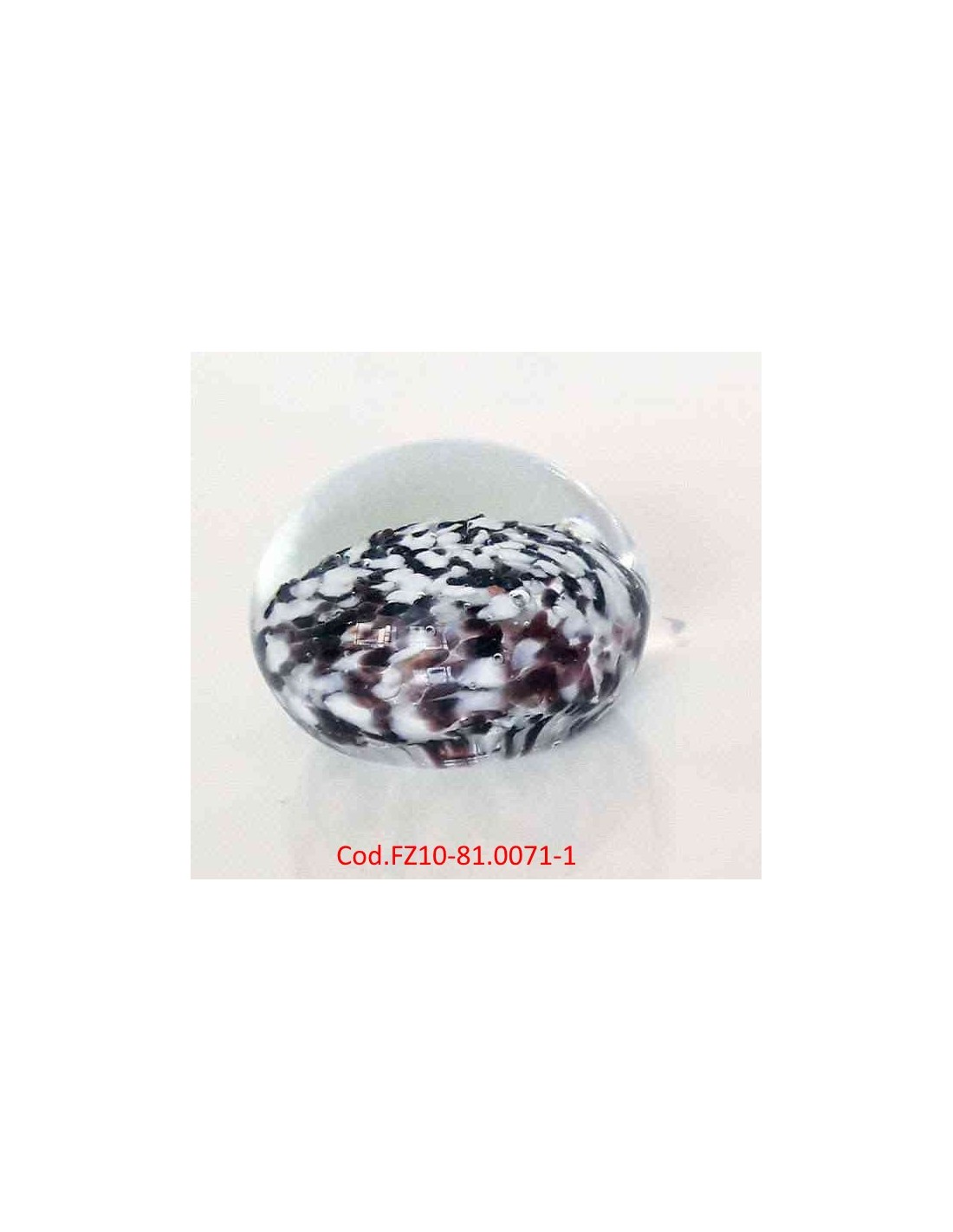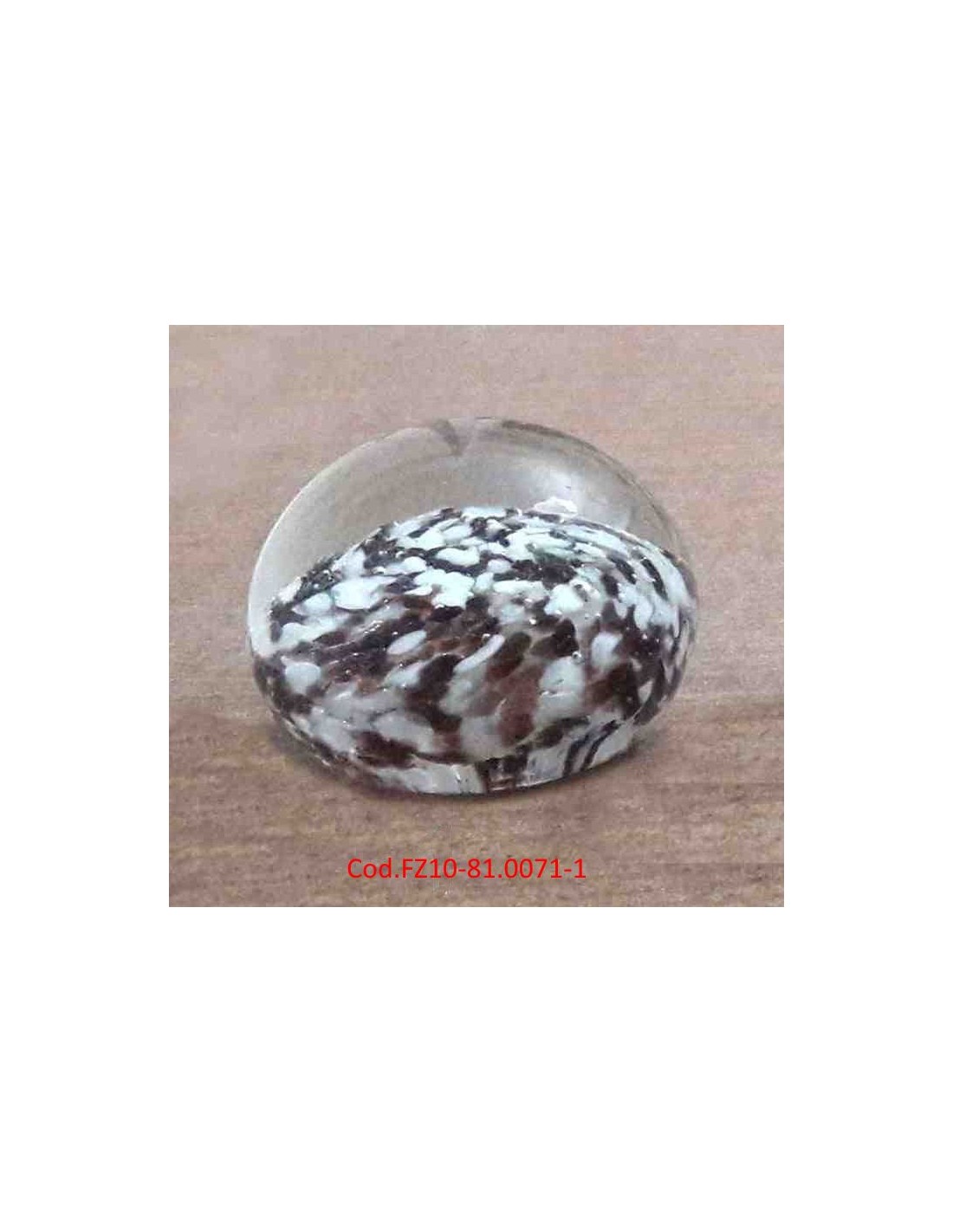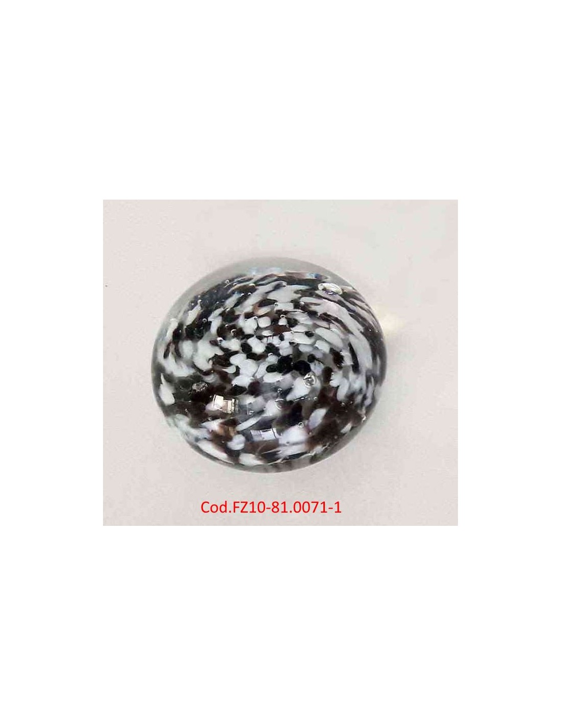 Fermacarte sferico realizzato in vetro artistico, caratterizzati da una base piatta per stabilità e una calotta superiore trasparente. L'interno presenta un motivo maculato o "a coriandoli" in bianco, nero, con sfumature marrone, integrato nella sfera.