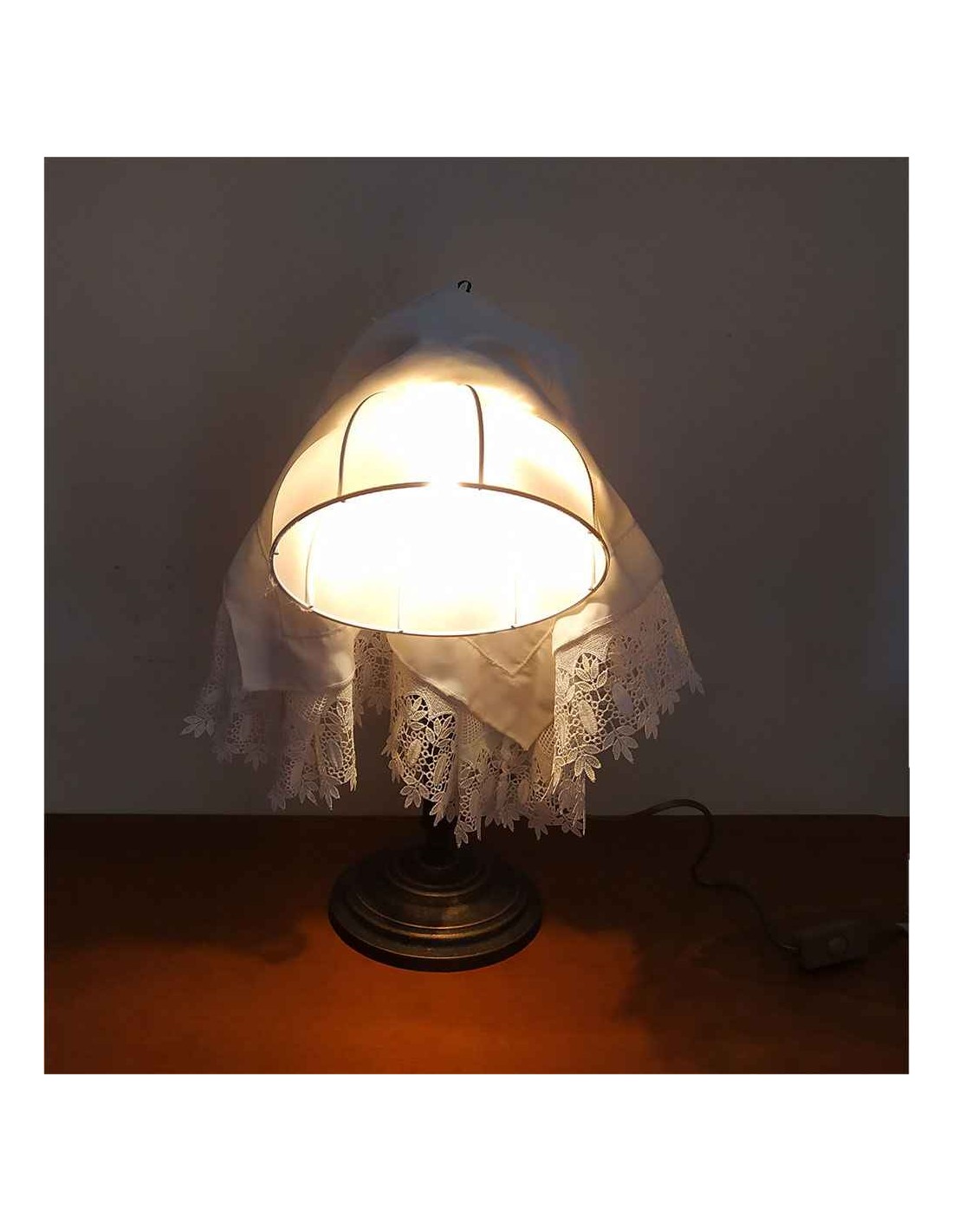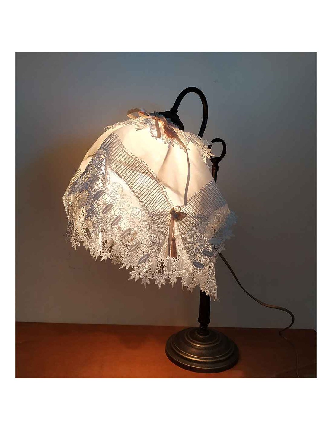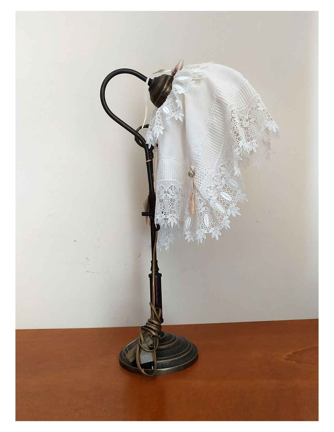 Illumina i tuoi spazi con un tocco di intramontabile romanticismo. Questa esclusiva lampada da tavolo vintage fonde la solidità del metallo brunito alla leggerezza impalpabile del pizzo bianco, creando un complemento d'arredo unico nel suo genere.