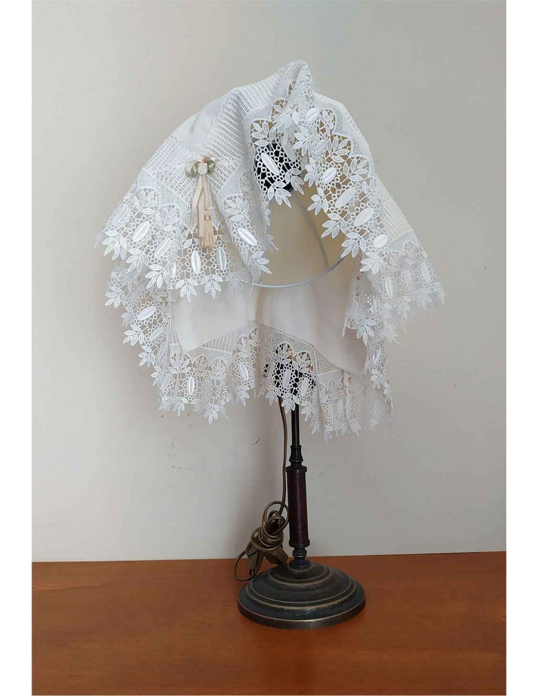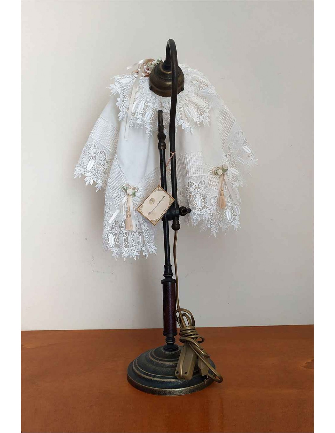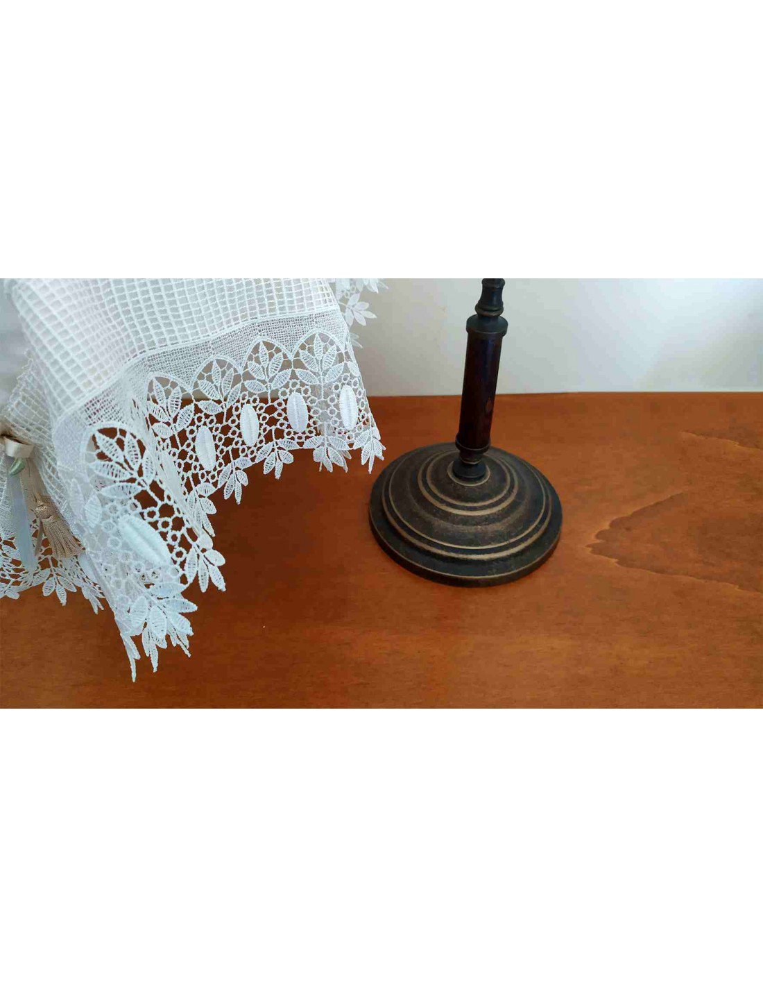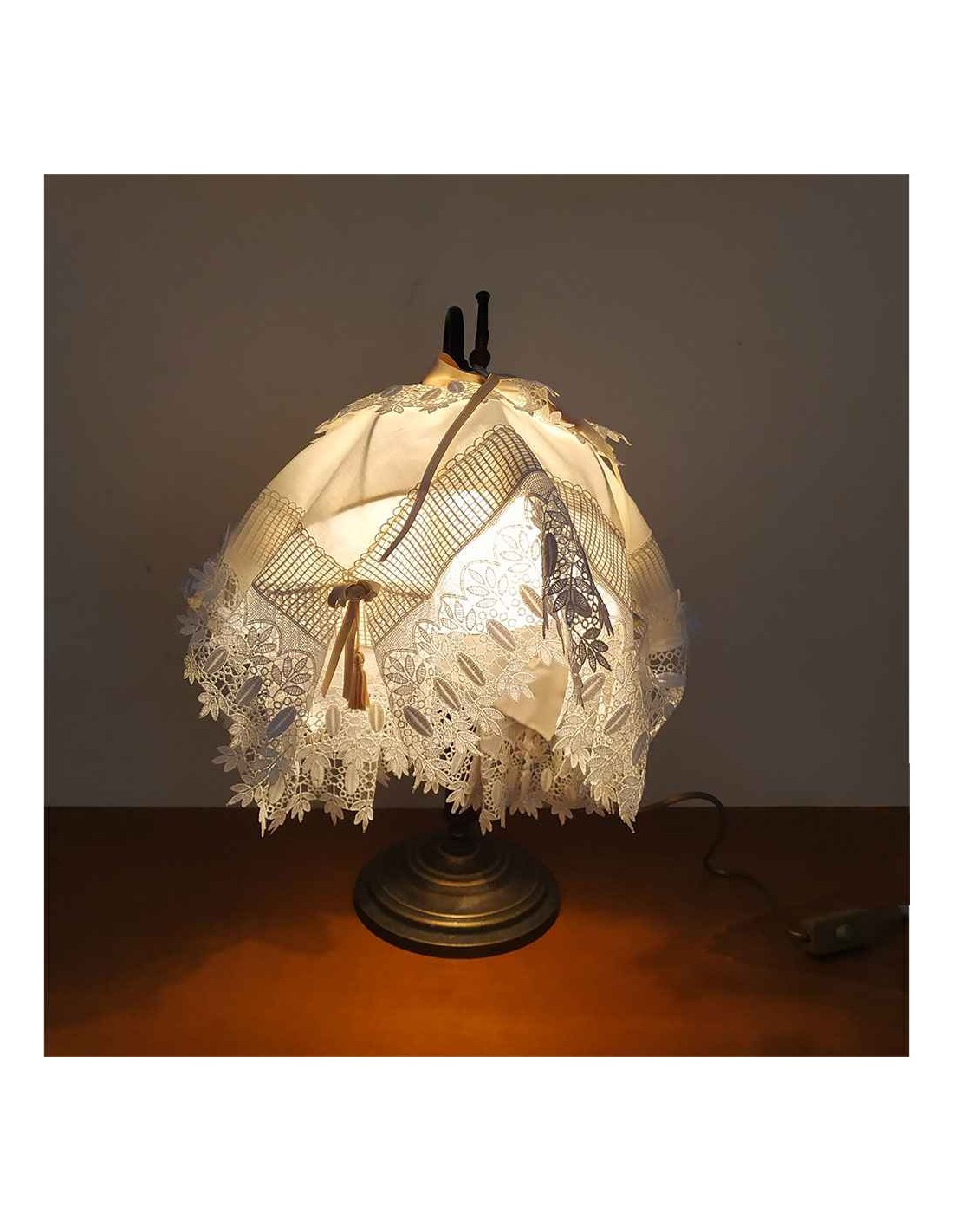 Illumina i tuoi spazi con un tocco di intramontabile romanticismo. Questa esclusiva lampada da tavolo vintage fonde la solidità del metallo brunito alla leggerezza impalpabile del pizzo bianco, creando un complemento d'arredo unico nel suo genere.