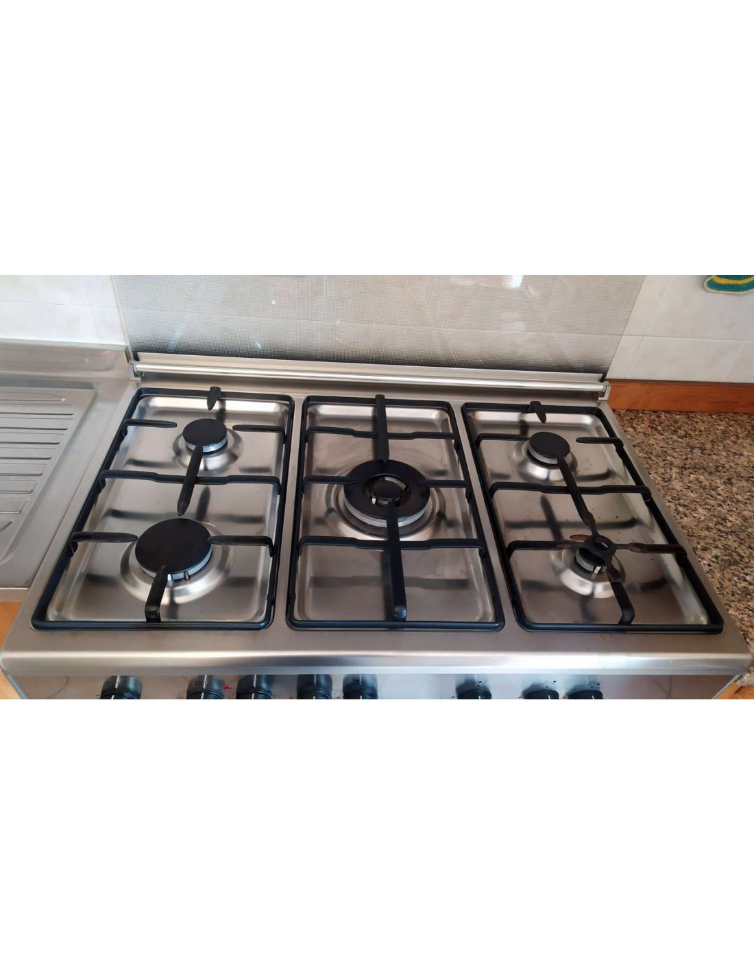 Cucina a libera installazione 90×60, con forno elettrico multifunzione, 5 bruciatori a gas di cui un doppia corona, griglie in acciaio smaltato, forno elettrico con 8 funzioni, accensione dei fuochi elettrica con protezione spegnimento fiamma, cucina provvista di cassetto scaldavivande posizionato sotto al forno. Cucina perfetta in tutto, tranne il piedino dx posteriore che presenta una lesione/rottura, ma perfettamente funzionante, visibile nelle foto pubblicate. Cucina completa di libretto di istruzioni e installazione in pdf (digitale)