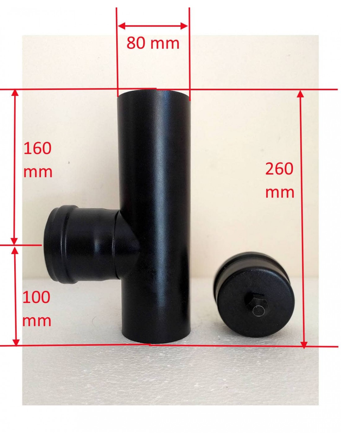 Raccordo-a-T-90°-con-tappo-di-scarico-acciaio-nero-per-stufe-a-pellet-Dimensioni