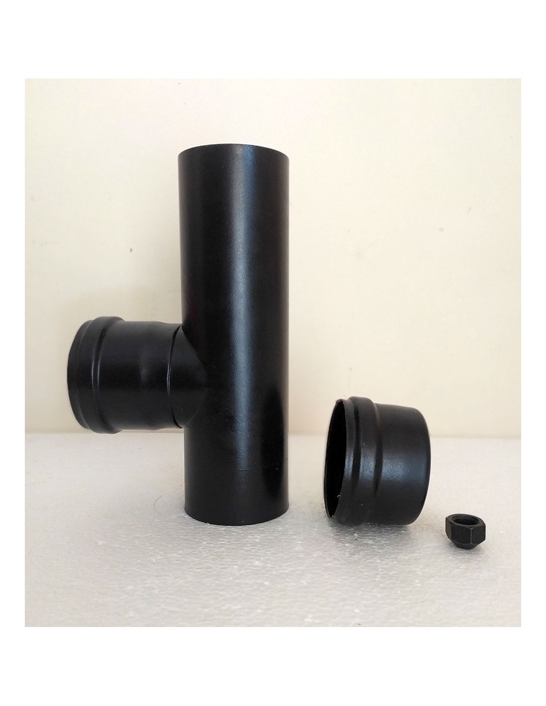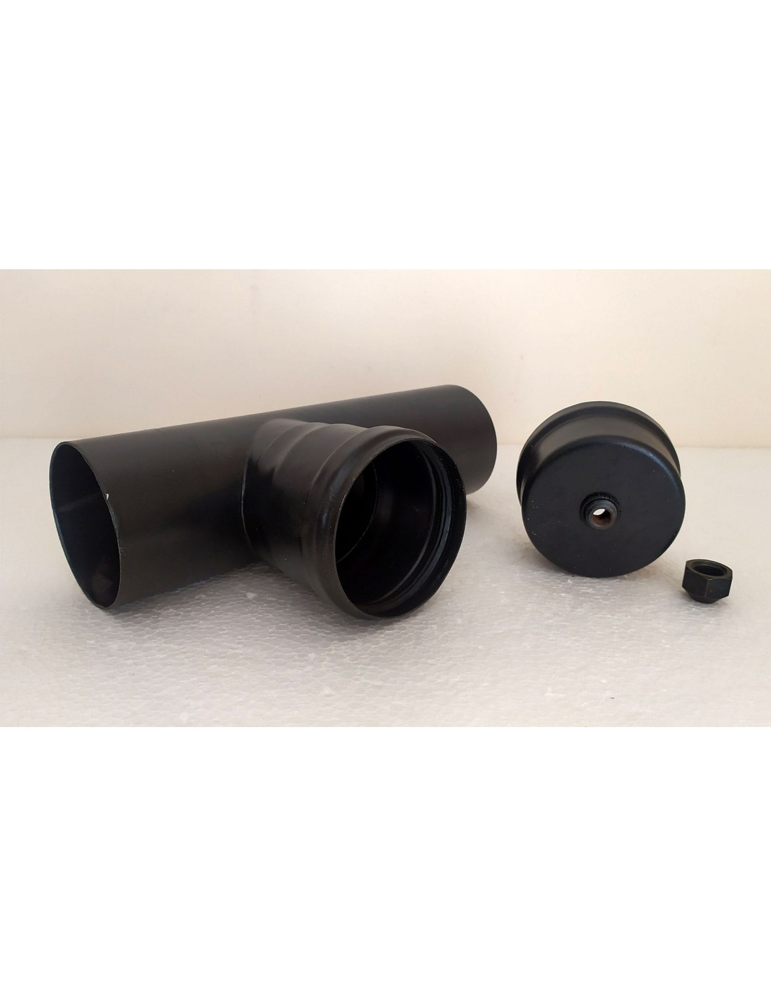 Raccordo-a-T-90°-con-tappo-di-scarico-acciaio-nero-per-stufe-a-pellet