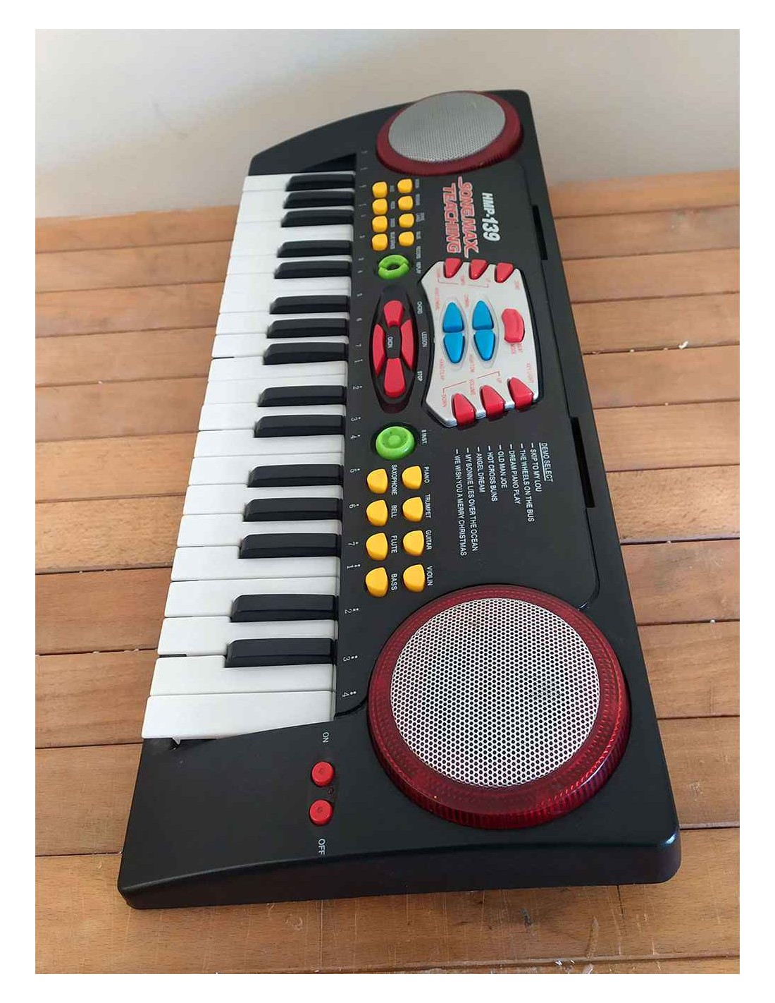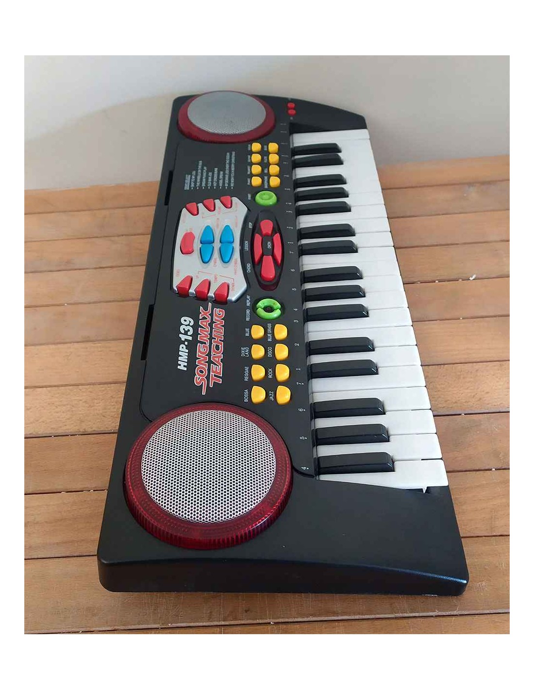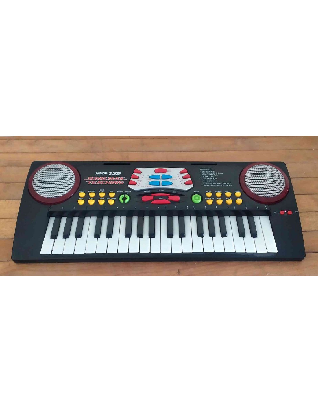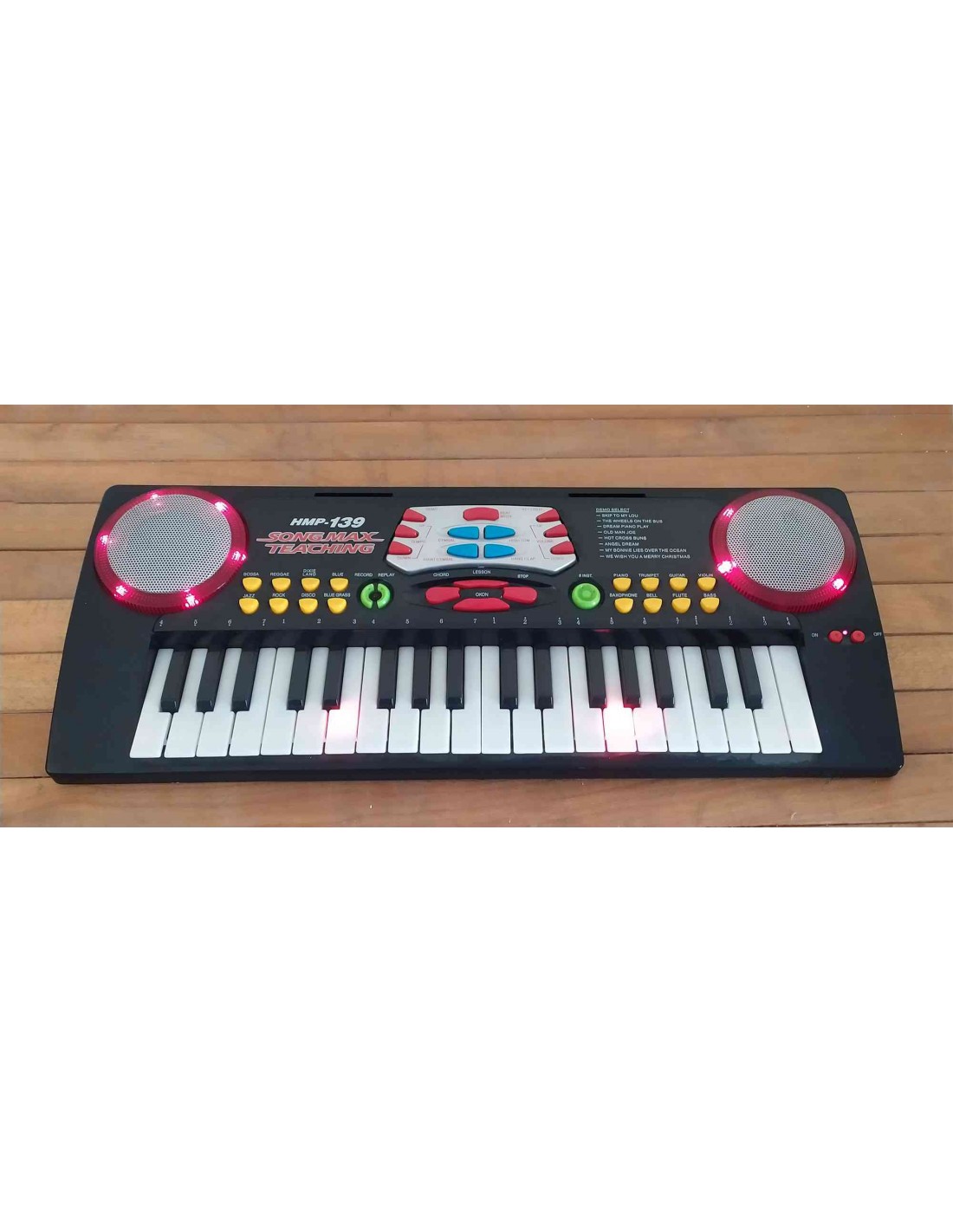 La tastiera per pianoforte didattico Songmax HMP-139 è una tastiera elettronica con 37 tasti totali, 22 tasti bianchi e 15 tasti neri, progettata per l'educazione musicale. Tastiera con vari suoni di strumenti selezionabili dai vari tasti presenti sullo strumento, con emissione luminosa alla pressione dei tasti. Dotata di interruttore On-Off presente nella parte inferiore dello strumento. Funziona con 4 batterie da 1,5 Volt non incluse, corredata di libretto di istruzioni cartaceo e a richiesta anche in formato Pdf.