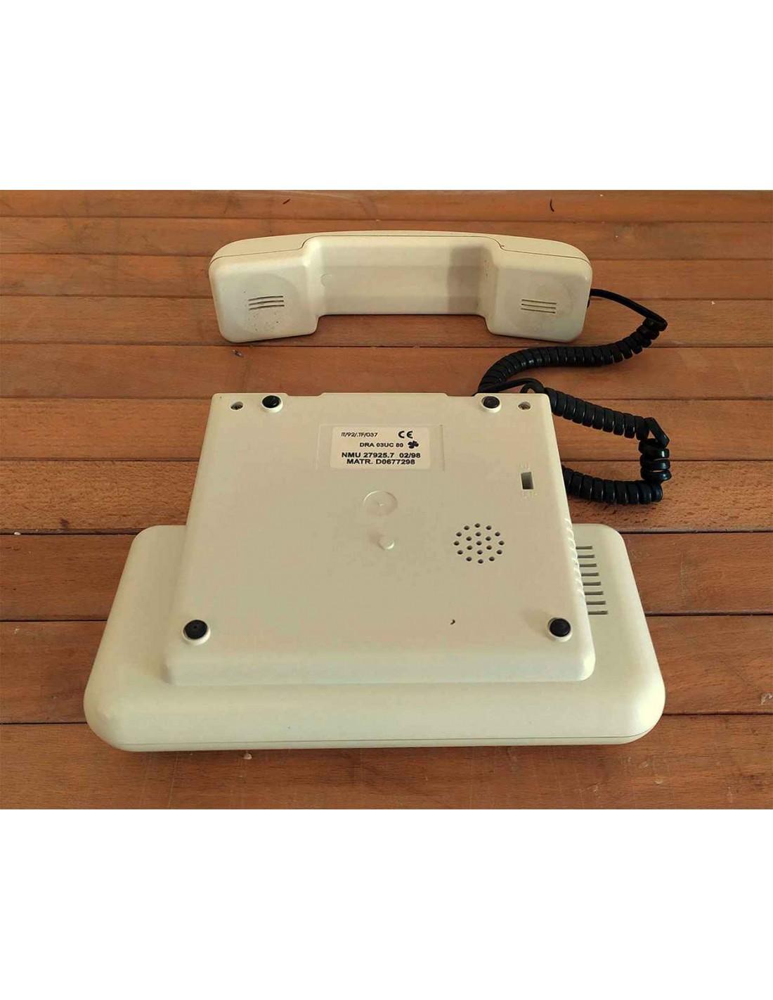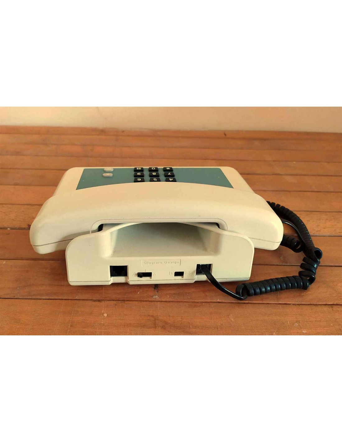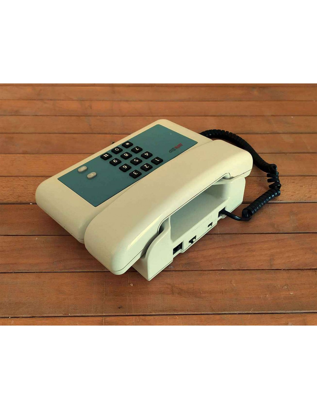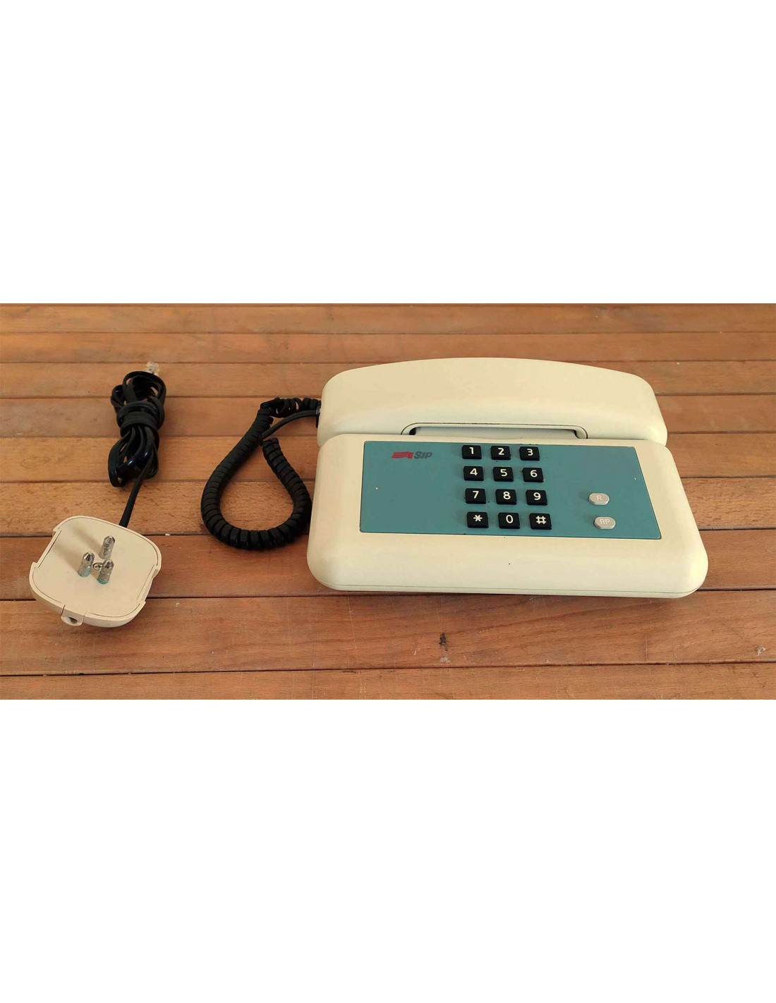 Telefono fisso da appoggio marchiato SIP color avorio, completo di cavetto e spina tripolare classica per il collegamento della linea telefonica a muro. Telefono anni '90 disegnato da Giugiaro, funzionante, con cornetta e cavo a spirale nero. Telefono con mascherina blu con all'interno 12 tasti di colore nero con sopra la stampigliatura dei numeri da 0 a 9 più i tasti Asterisco e Cancelletto, più 2 tasti di colore grigio con le scritte R ed RP, dotato di doppia regolazione del volume suoneria Basso e Alto.