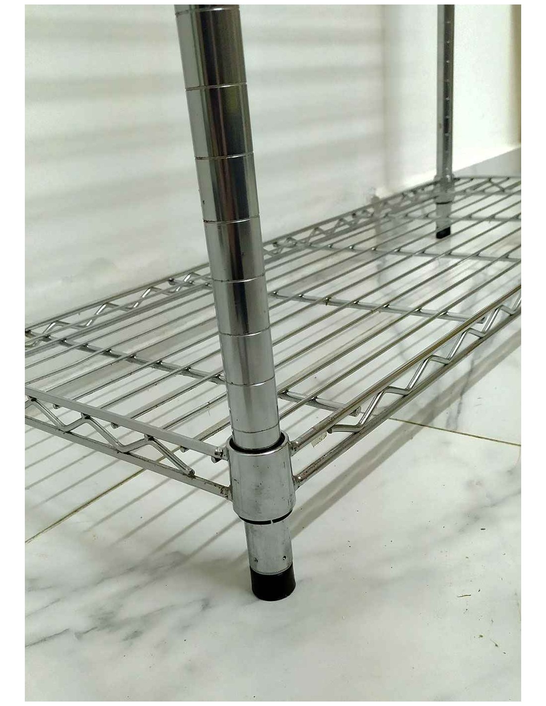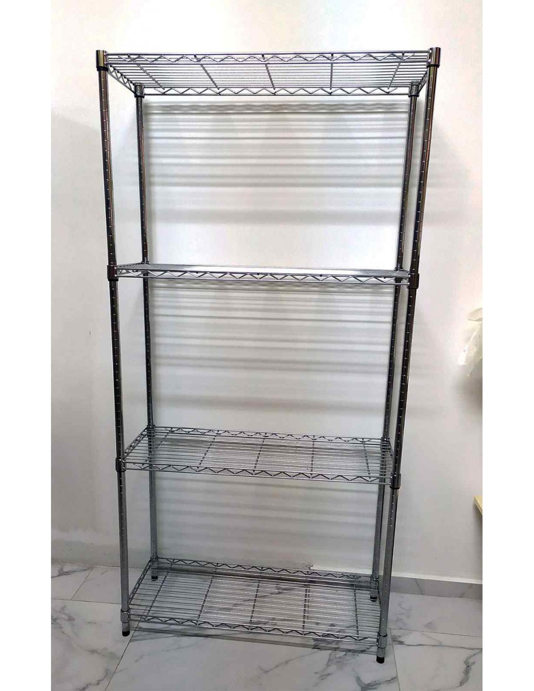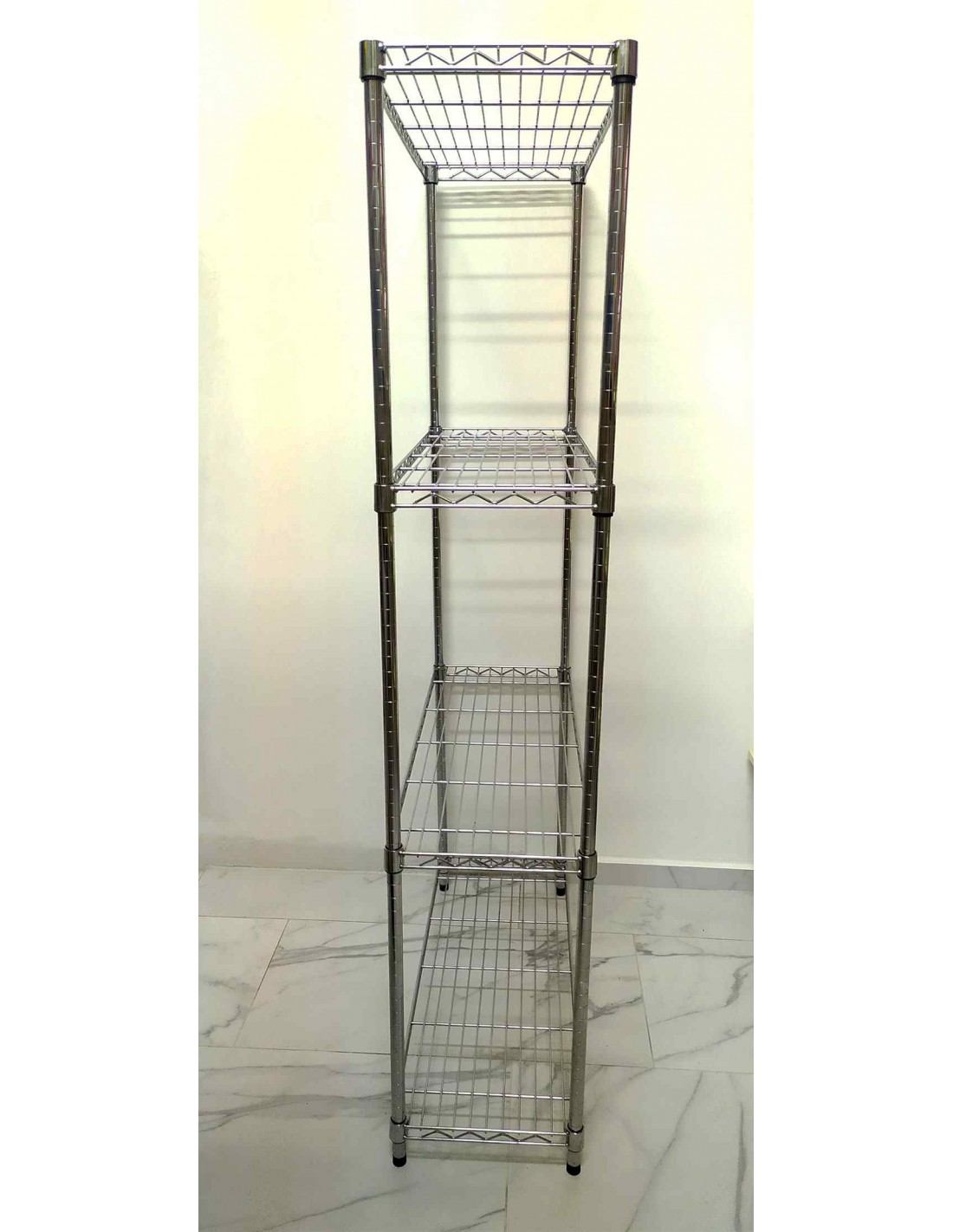 Scaffale ideale per negozi, uffici, ed abitazioni, perfetto per la conservazione di documenti, stoccaggio e materiale da esposizione o da ufficio, con supporto fino a 50 kg di carico a ripiano uniformemente distribuito. Scaffale realizzato in acciaio cromato di alta qualità, progettato per contenere oggetti di diverse tipologie e dimensioni, per cui i ripiani sono regolabili in altezza. Scaffale modulabile, permette di scegliere il numero di ripiani, da montare, da un minimo 2 a massimo 4 ripiani. Scaffale dotato di 4 ripiani da 90x36 cm e 4 piedini regolabili montati alla base dei montanti. Il montaggio dello scaffale può essere facilmenteveseguito con l'aiuto di un martello di gomma, grazie al suo montaggio senza viti e al rapido montaggio dei componenti.