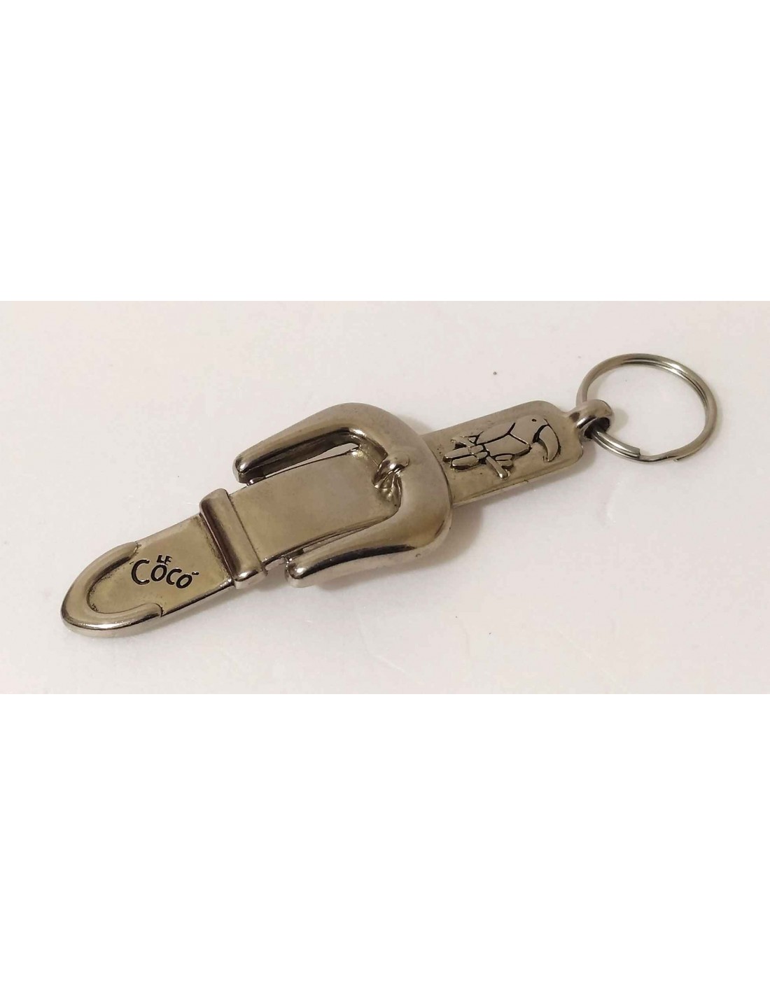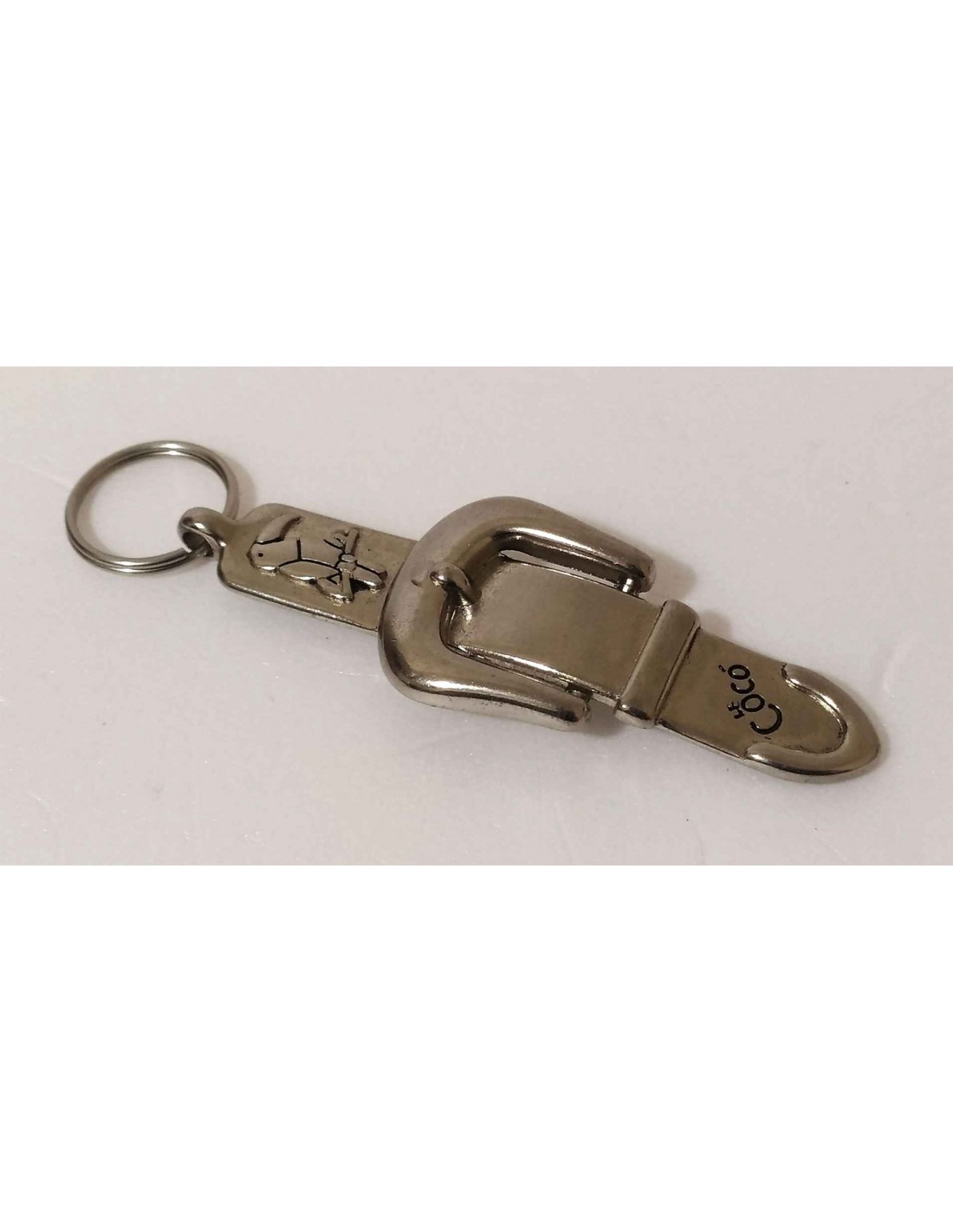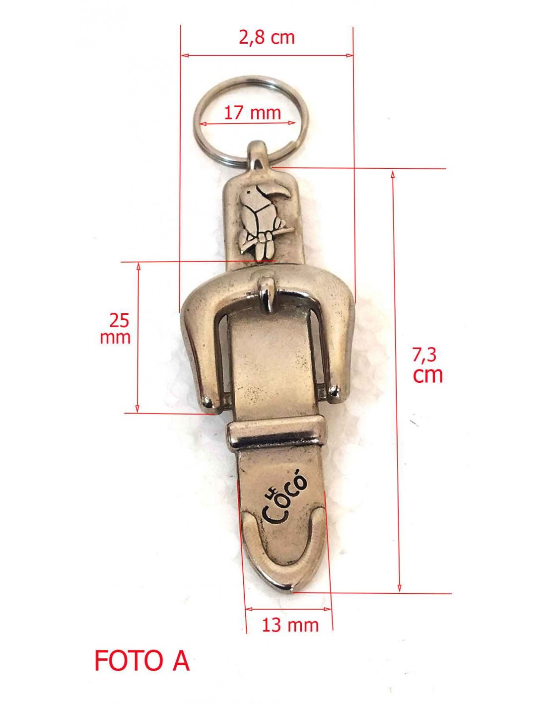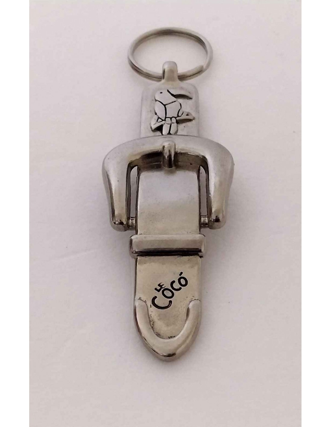Aggiungi un tocco di carattere al tuo mazzo di chiavi con questo esclusivo portachiavi vintage firmato "Le Cöcó". Caratterizzato da un design unico e ricercato, l'oggetto riproduce fedelmente la forma di una fibbia per cintura, completa di ardiglione e passante, realizzata in solido metallo argentato con finitura lucida.