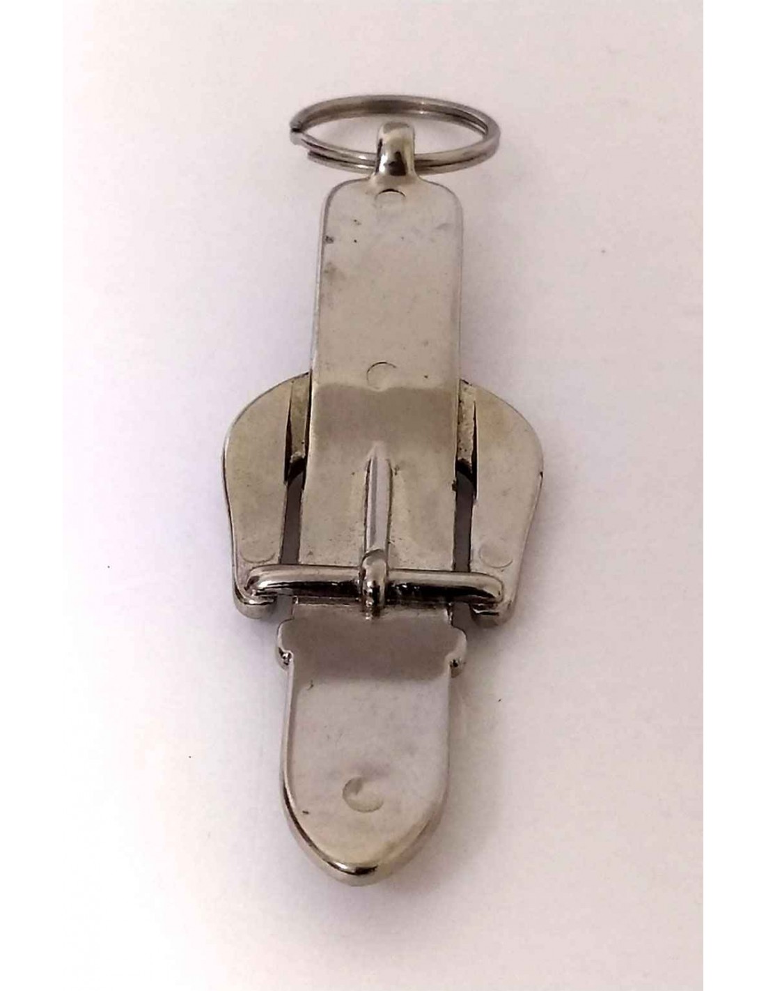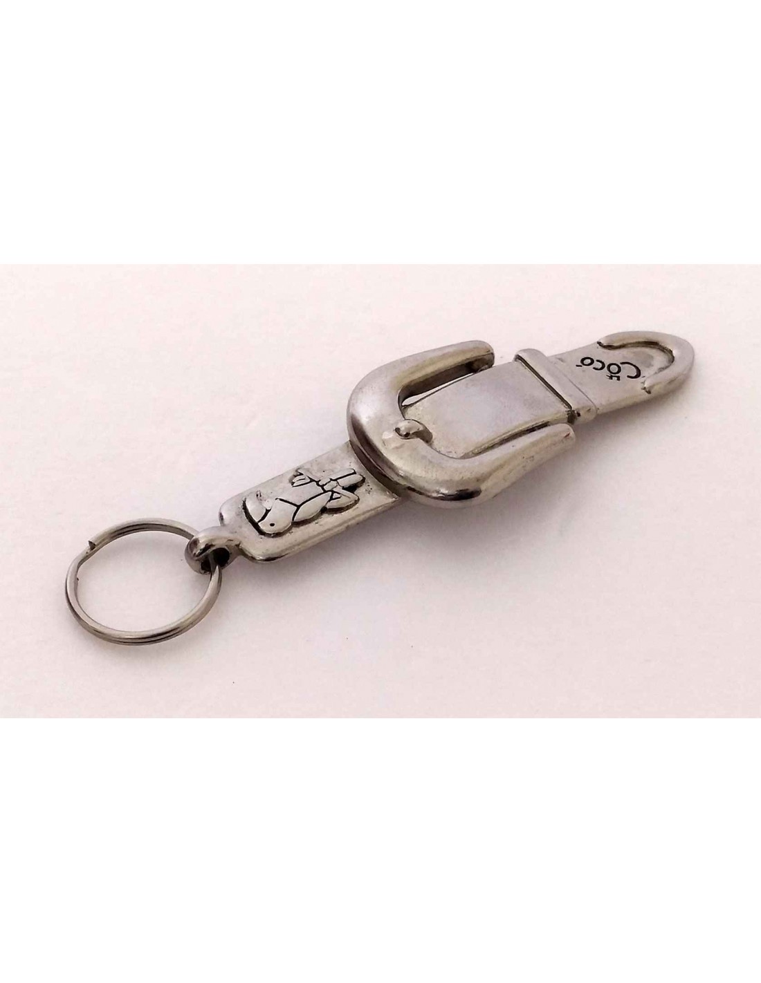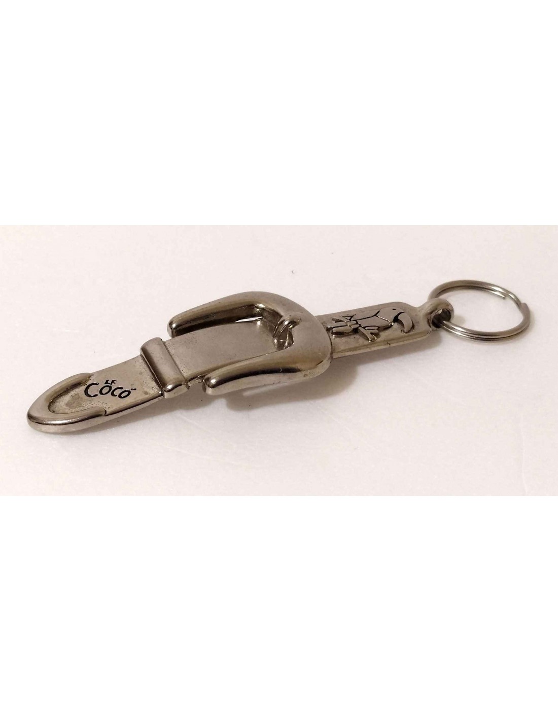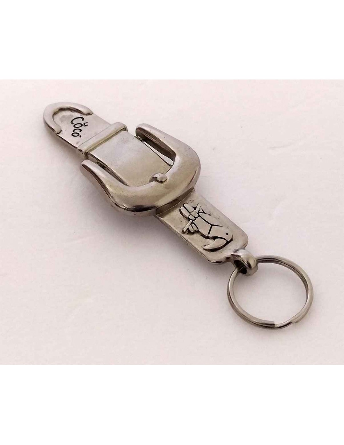 Aggiungi un tocco di carattere al tuo mazzo di chiavi con questo esclusivo portachiavi vintage firmato "Le Cöcó". Caratterizzato da un design unico e ricercato, l'oggetto riproduce fedelmente la forma di una fibbia per cintura, completa di ardiglione e passante, realizzata in solido metallo argentato con finitura lucida.