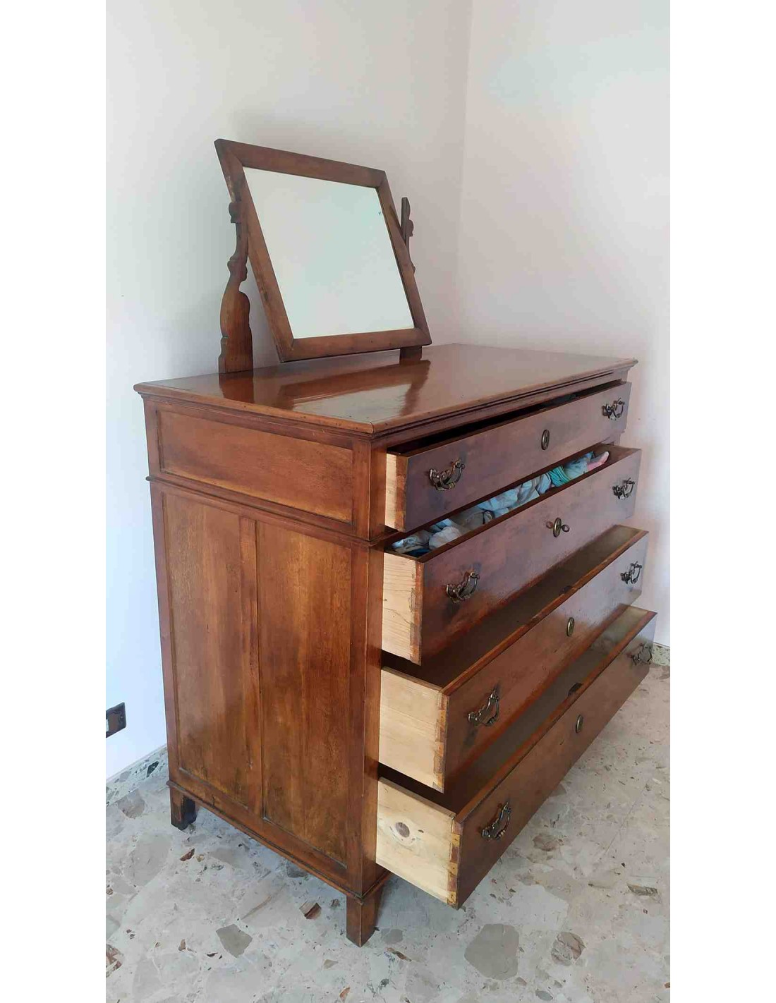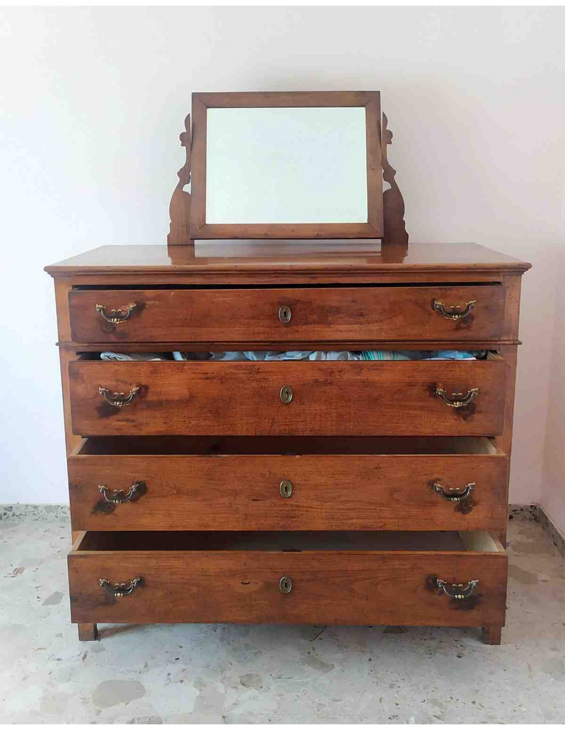 Como' antico in legno massello con specchiera inclinabile e staccabile, sfilandola dalla sua sede in legno, dotato di con 4 cassettoni, muniti di due comode maniglie ciascuno, con chiusura a chiave centralmente al cassettone, piedi in legno integrati nella struttura del como'. Il como' e' in ottime condizioni anche se datato, non tarlato.