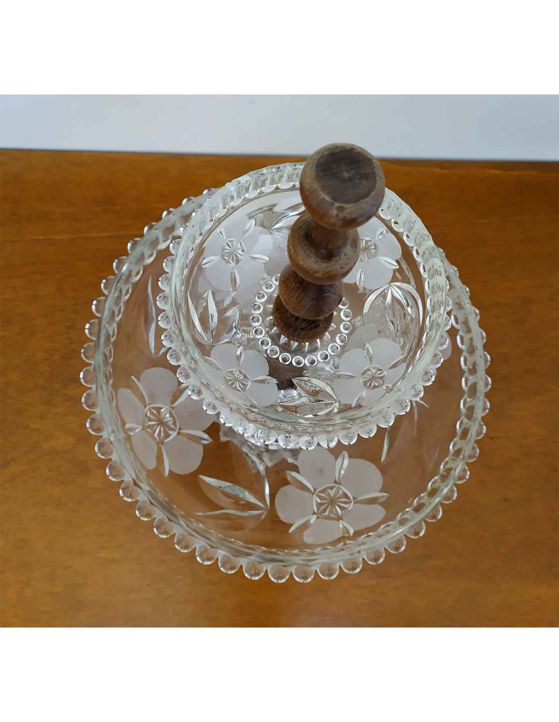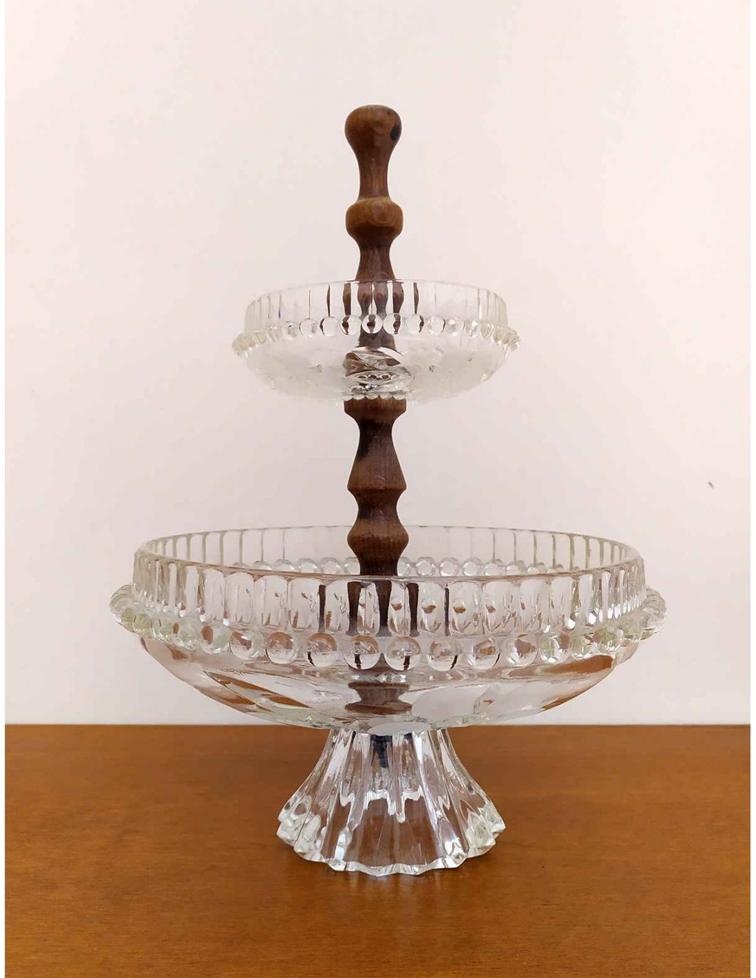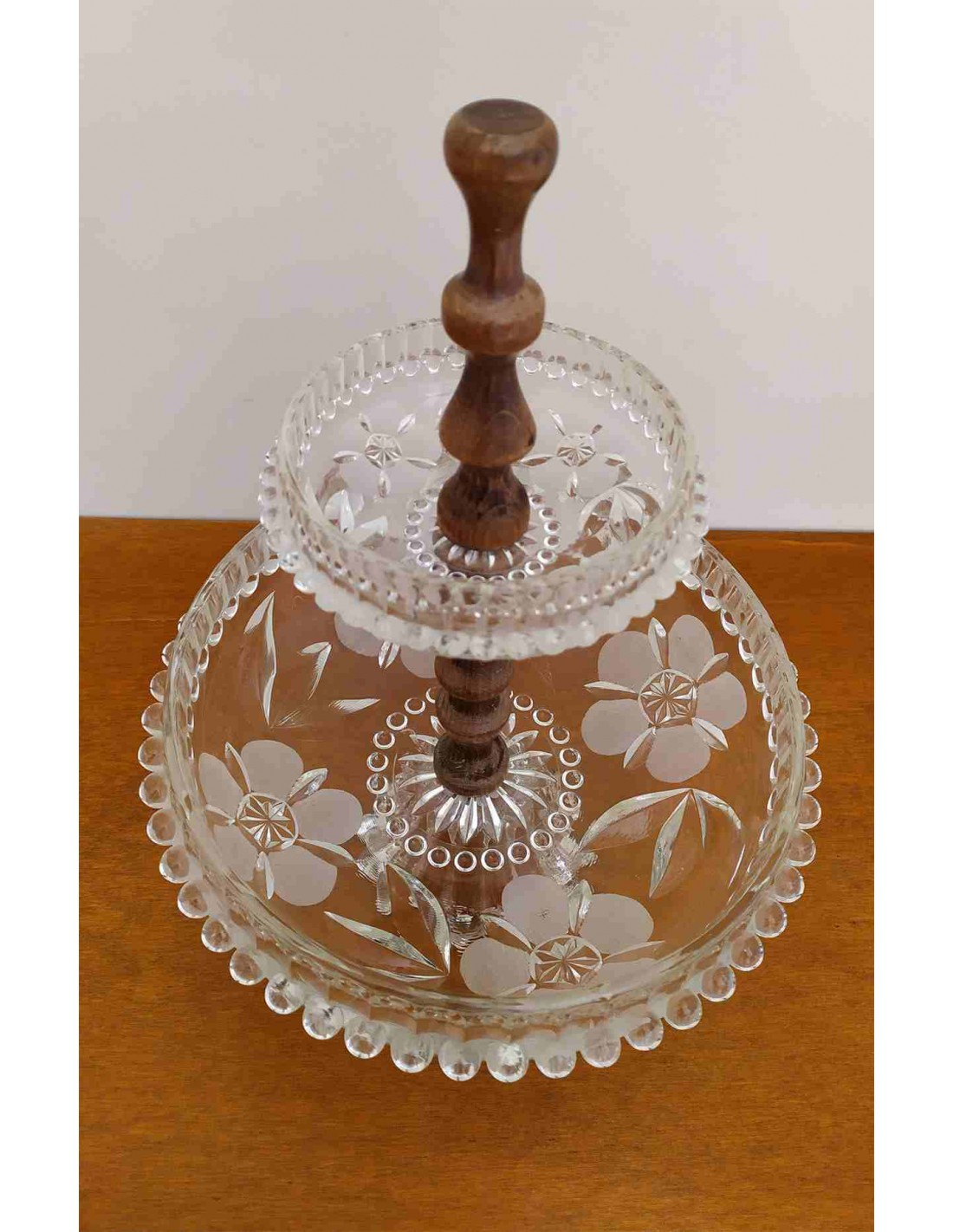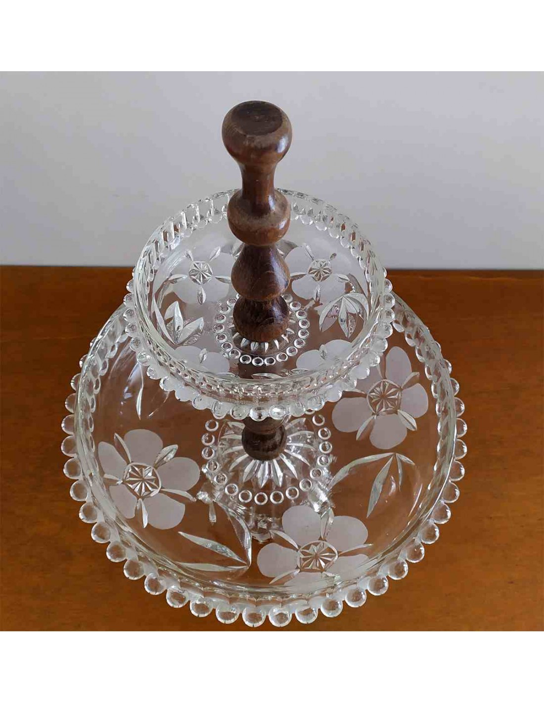 Alzata Vintage 2 Piani Vetro Floreale e Legno Dolci/Frutta Ø23xH31cm - Usato