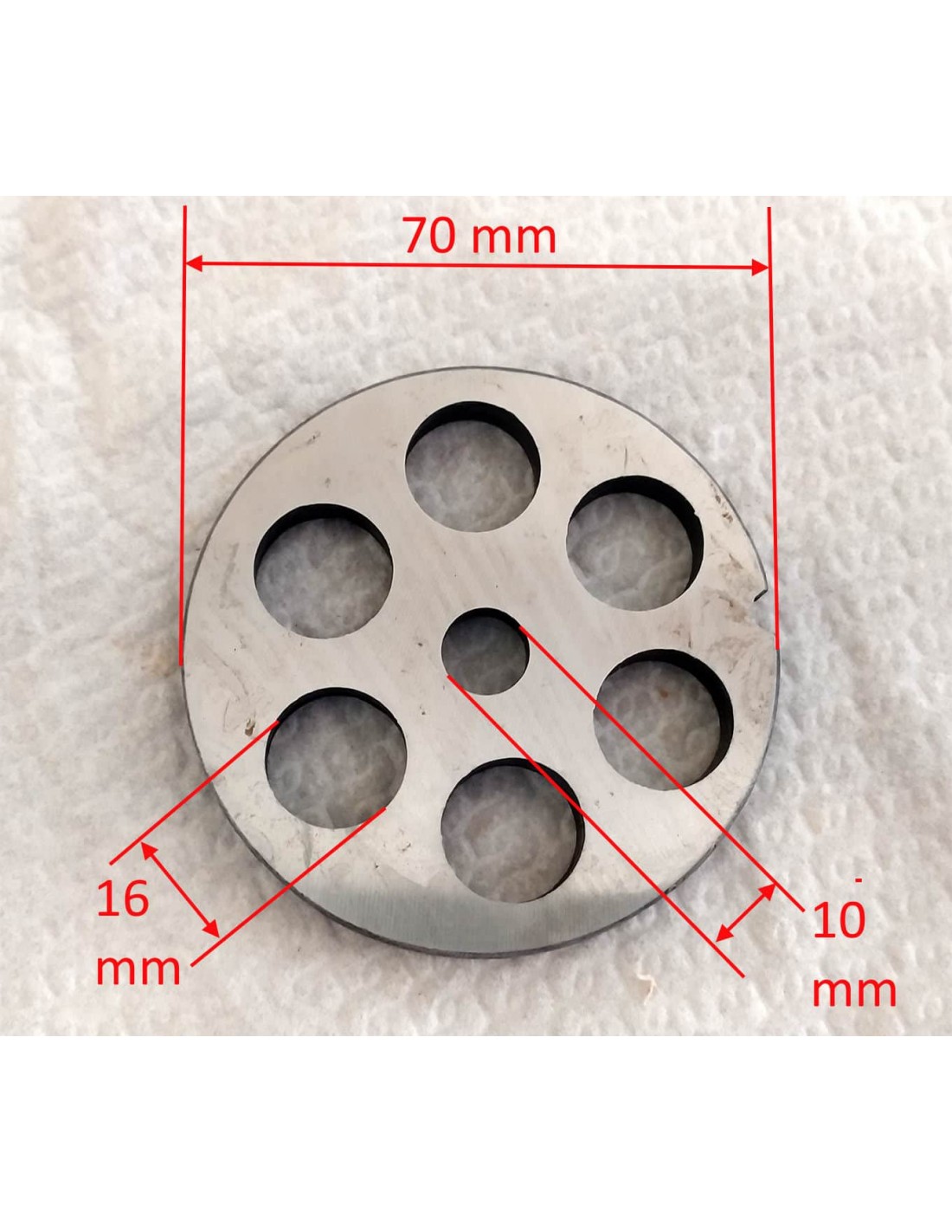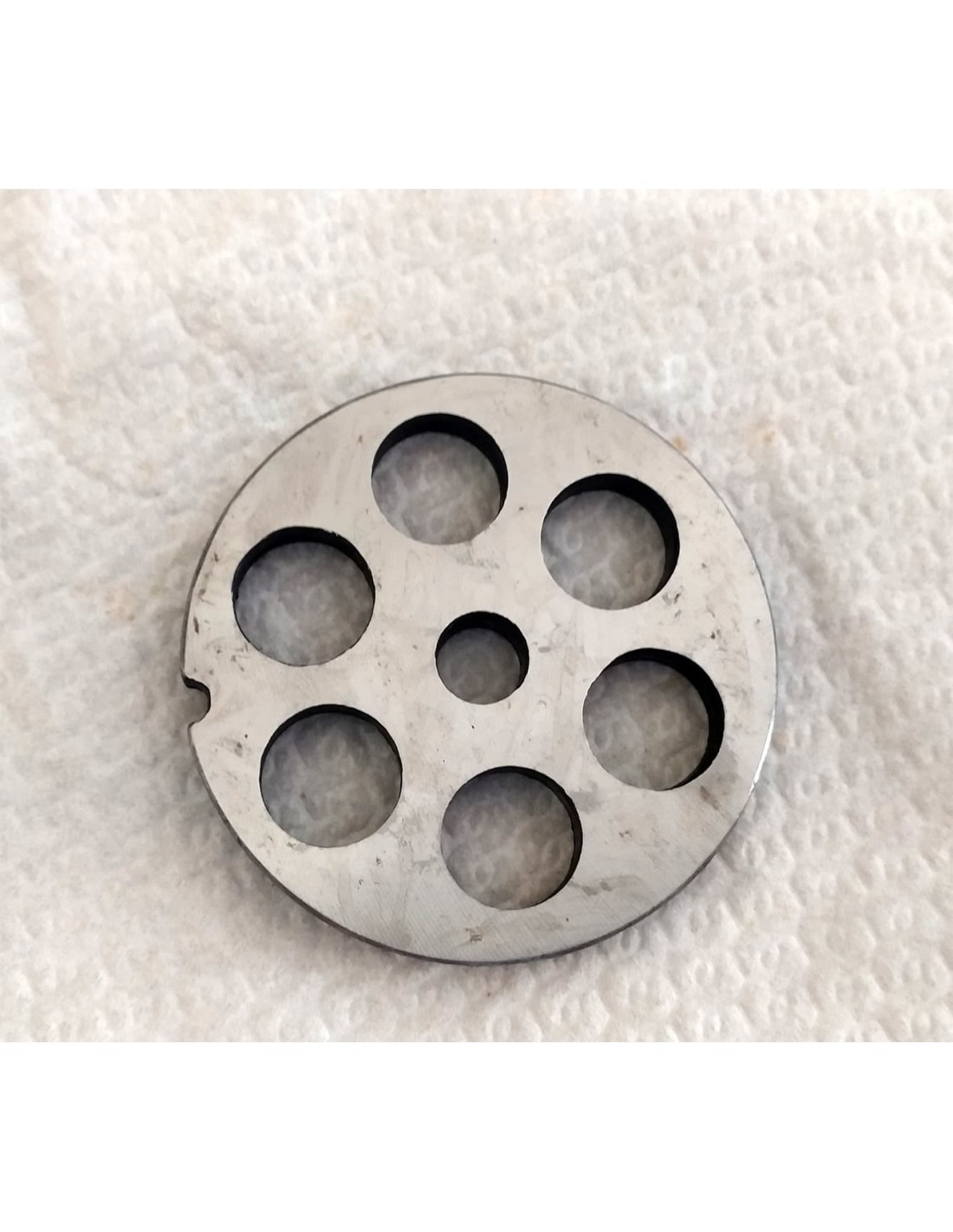 Piastra trafila in acciaio temperato con 6 fori da 16 mm, per tritacarne elettrico N°12 e tritacarne manuale Porkert N°10.