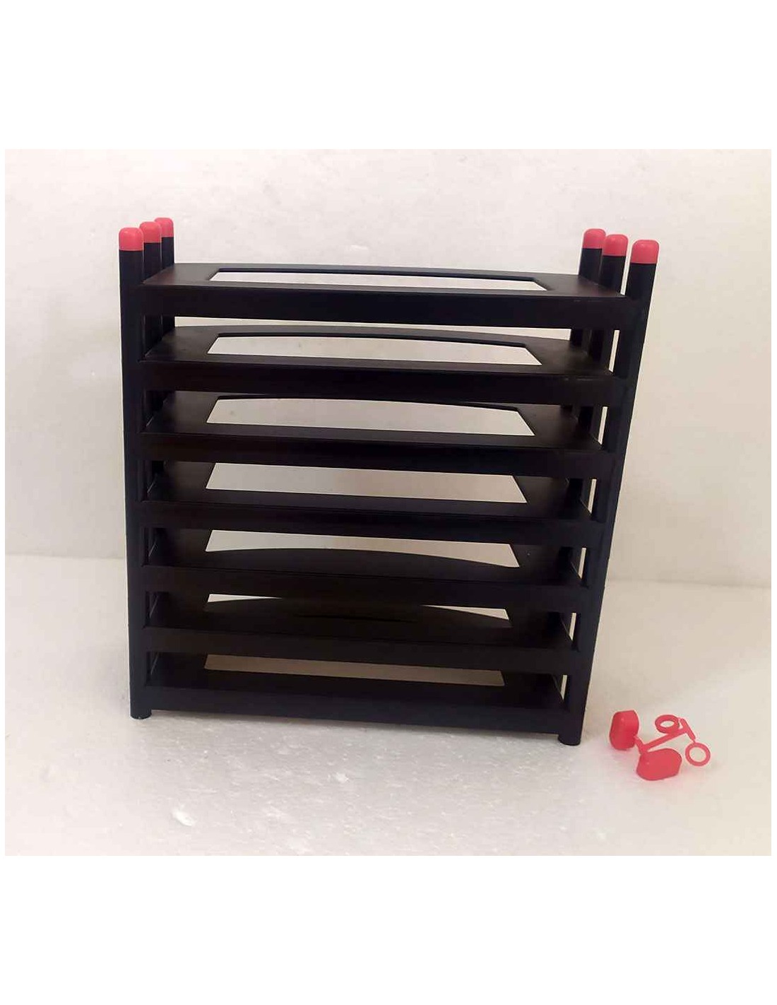 Struttura in plastica nera resistente con iconici dettagli ad anelli rossi sui montanti. Struttura leggera e compatta, ideale da esporre su mensole, scrivanie o accanto al tuo vecchio videoregistratore. Che tu sia un collezionista accanito di film cult, un appassionato di vaporwave o semplicemente alla ricerca di un oggetto di design d'epoca, questo supporto è un "must-have". Perfetto anche come idea regalo originale per amanti del cinema e nostalgici.