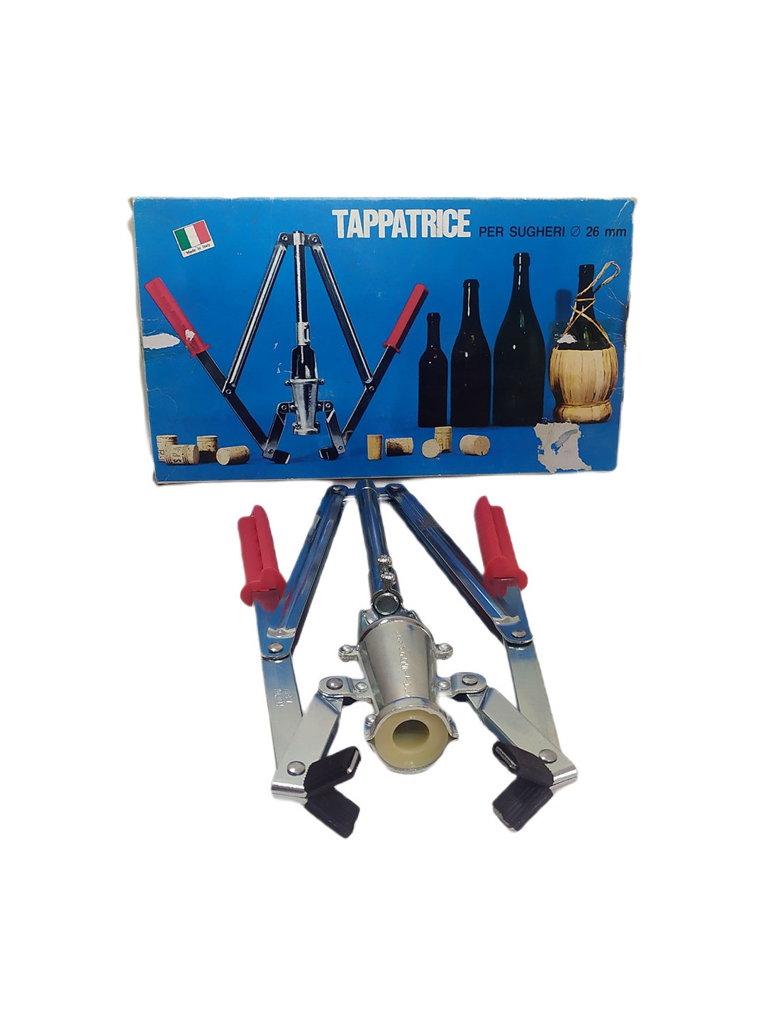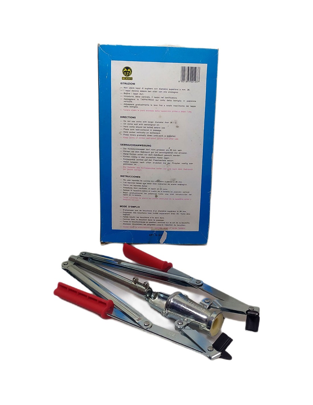 Tappatrice Universale per tappi in Sughero, con morsetto per sugheri da ø 26mm. Tappatrice manuale a doppia leva completamente in acciaio. Tappatrice con guida conica in Nylon per Sugheri, impughatura in Plasticata.