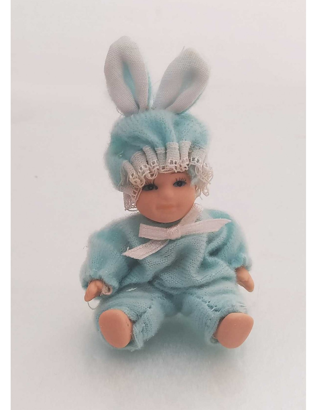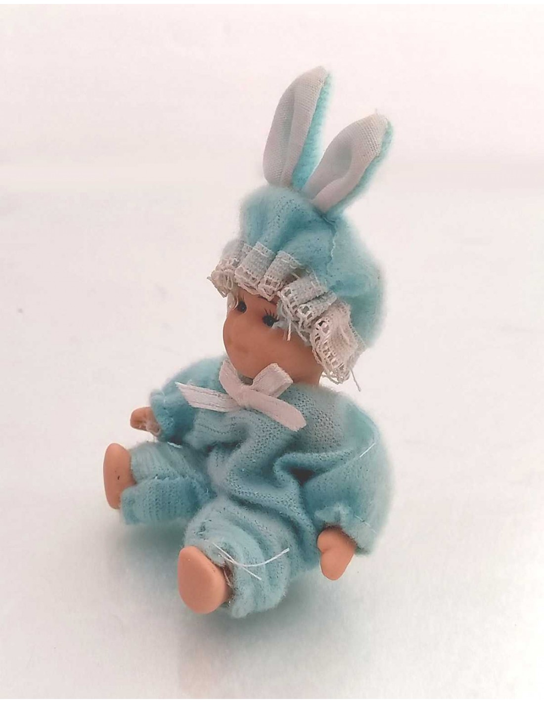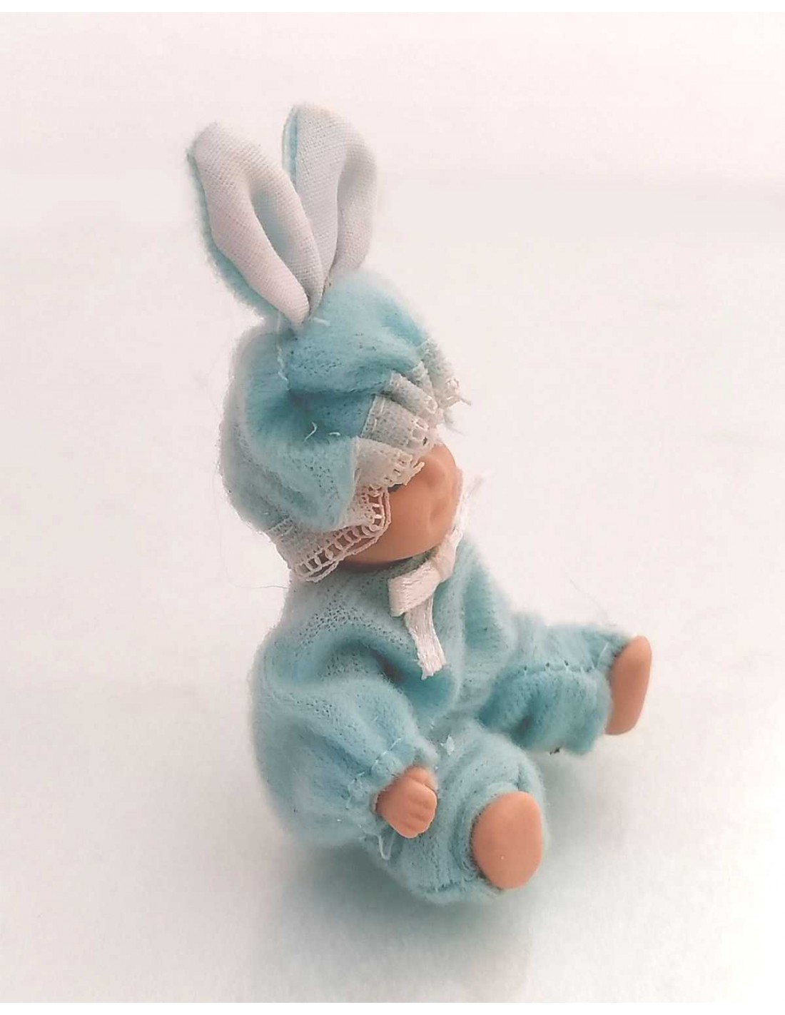 Coniglietto in ceramica con vestito e cappello celeste 5x8 cm arti snodabili