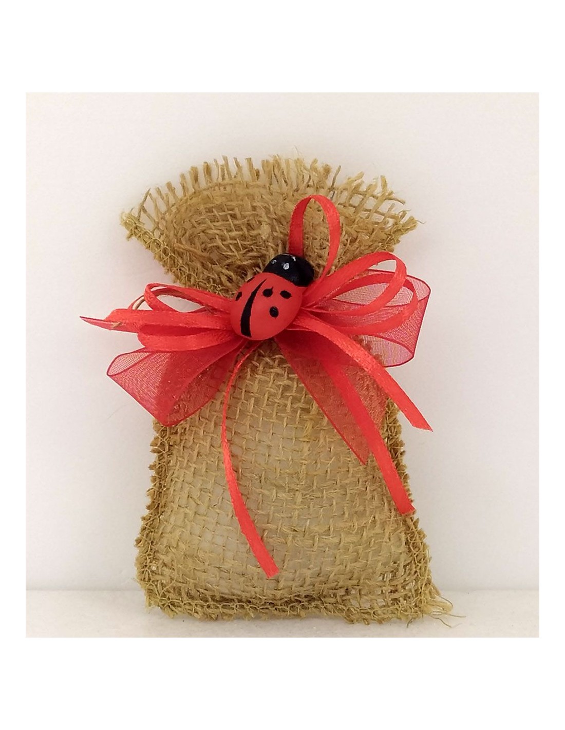 Coccinella-Rossa-Legno-con-Spilla- Fiocchetto-Rosso-su-juta