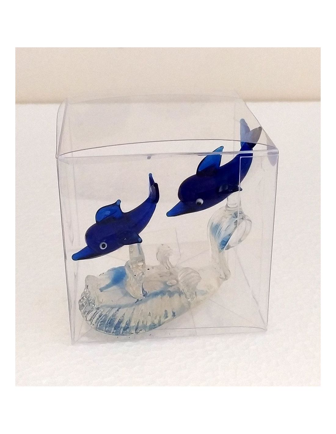 Delfini in vetro, assortiti di colore blu o azzurro, posizionati in coppia su base di vetro trasparente con nota di colore, con posizioni varie, completi di scatola trasparente, con fiocco e nastro per legare la scatola, più il tulle per contenere i confetti.