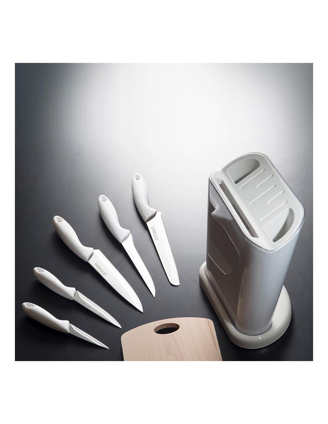 Ceppo Multifunzione portacoltelli in plastica colorata, con 5 coltelli in acciaio inox di alta qualità e un tagliere in legno. Ceppo portacoltelli, pratico e moderno, che riunisce in un unico set tutto ciò che serve per tagliare in cucina. I coltelli sono lavabili in lavastoviglie anche se si consiglia il lavaggio a mano. Disponibile in diversi colori.
