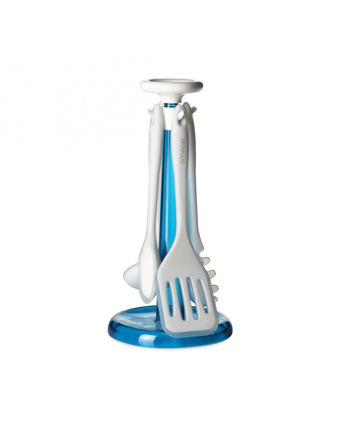 Porta mestoli composto da 4 mestoli, in acrilico e silicone, con base colorata.