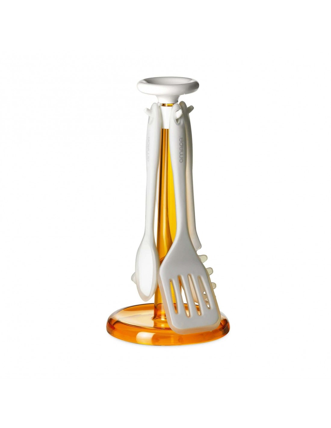 Porta mestoli composto da 4 mestoli, in acrilico e silicone, con base colorata.