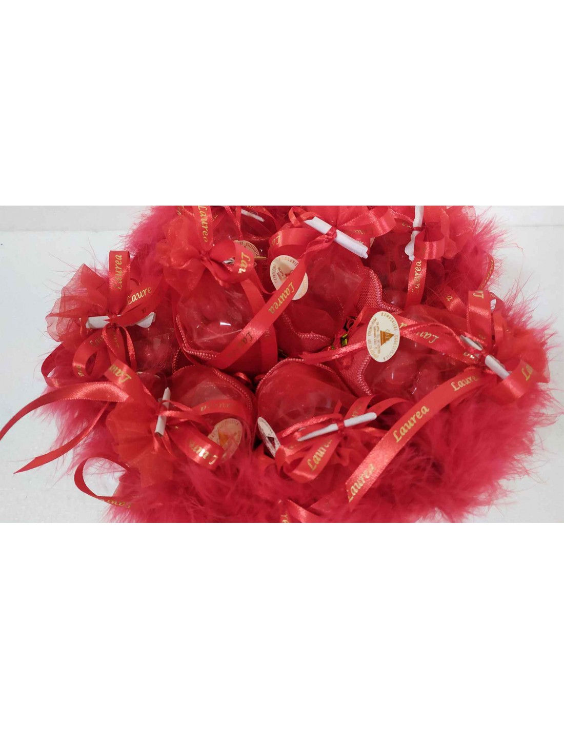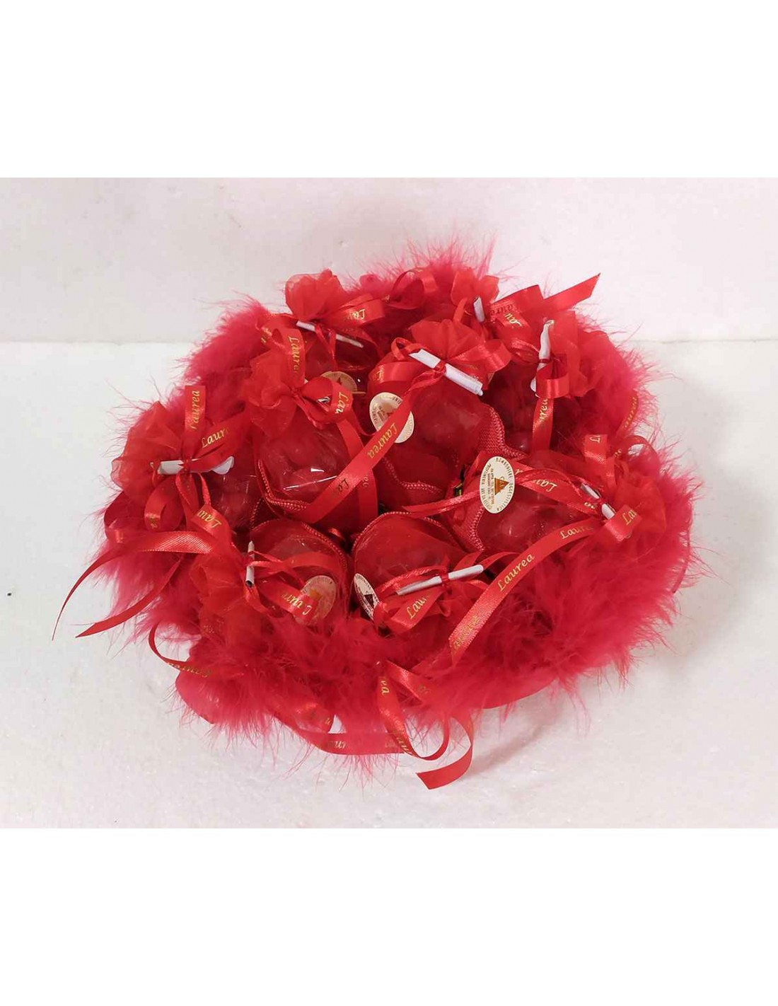Celebra il traguardo della Laurea con un tocco di classe e vivacità. Questo esclusivo cesto portabomboniere in vimini, ideale per un’esposizione scenografica e curata nei minimi dettagli per il proprio evento. Una struttura circolare in vimini fatto a mano, robusta interamente rivestita di soffici piume rosse, che donano volume e un effetto visivo dinamico e festoso. Cesto arricchito da eleganti nastri in raso rosso con stampa dorata "Laurea", che richiamano la solennità dell'occasione. Perfetto per contenere e presentare sacchetti, scatoline o piccoli cadeaux de mariage in modo ordinato e accattivante. Ogni componente è applicato con cura per garantire una tenuta perfetta durante tutta la durata dell'evento.