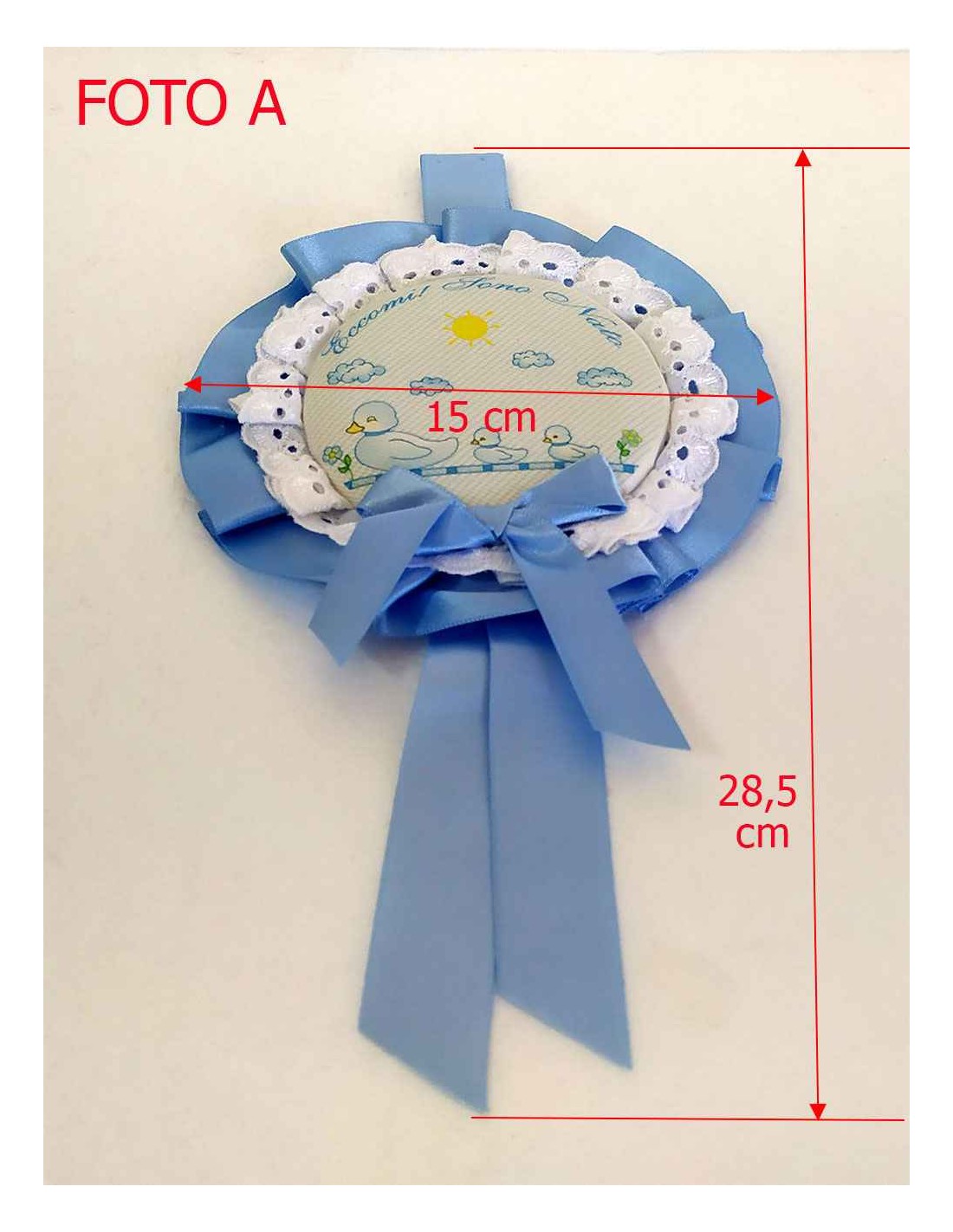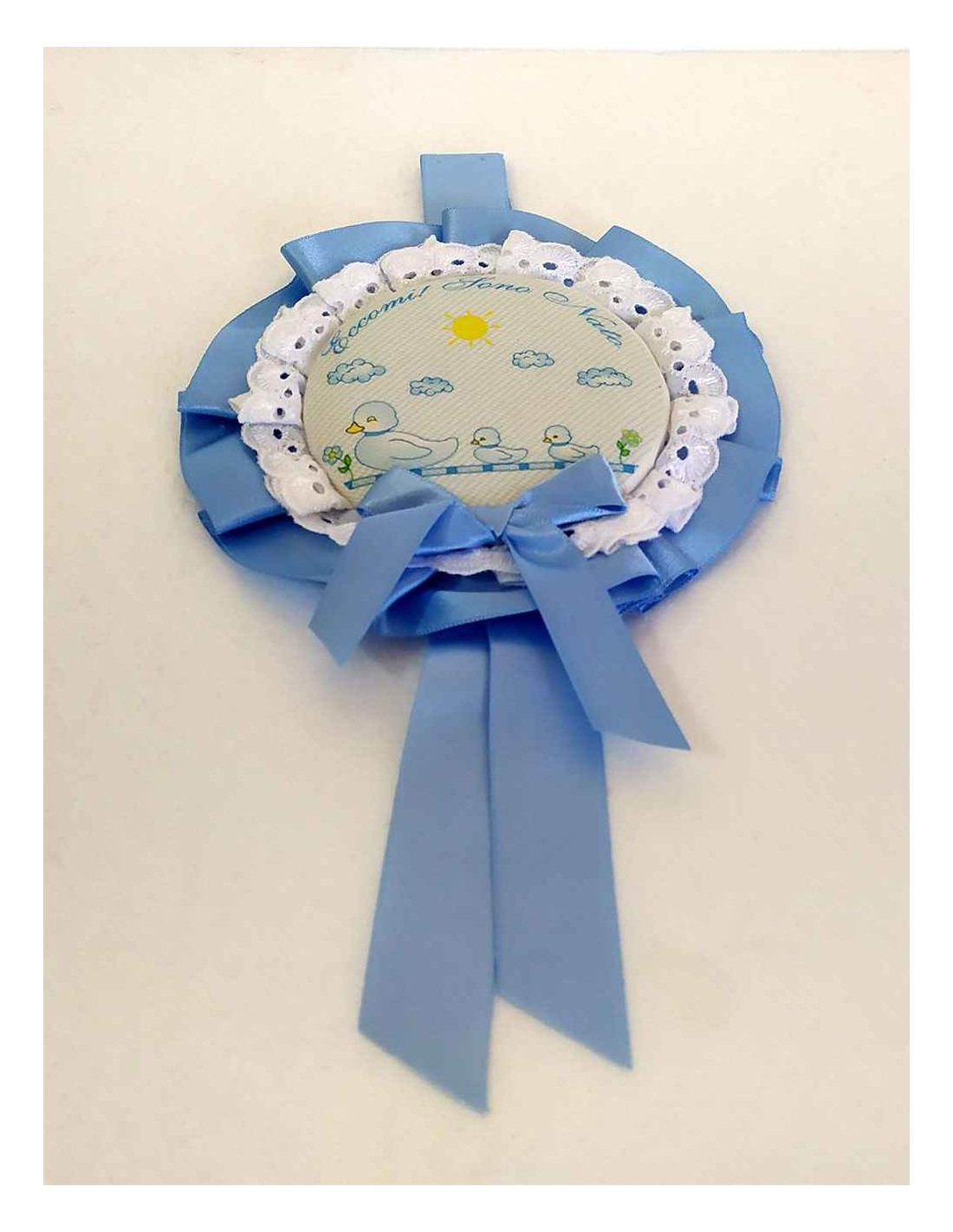 Annuncia l'arrivo del tuo bambino con la dolcezza e l'eleganza di questo fiocco nascita artigianale. Caratterizzato da una raffinata tonalità di azzurro polvere, questo fiocco a forma di coccarda è il dettaglio perfetto per decorare la porta di casa o la culletta in ospedale, condividendo con il mondo la gioia del lieto evento.