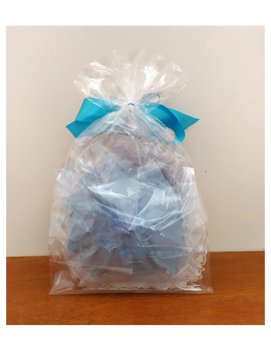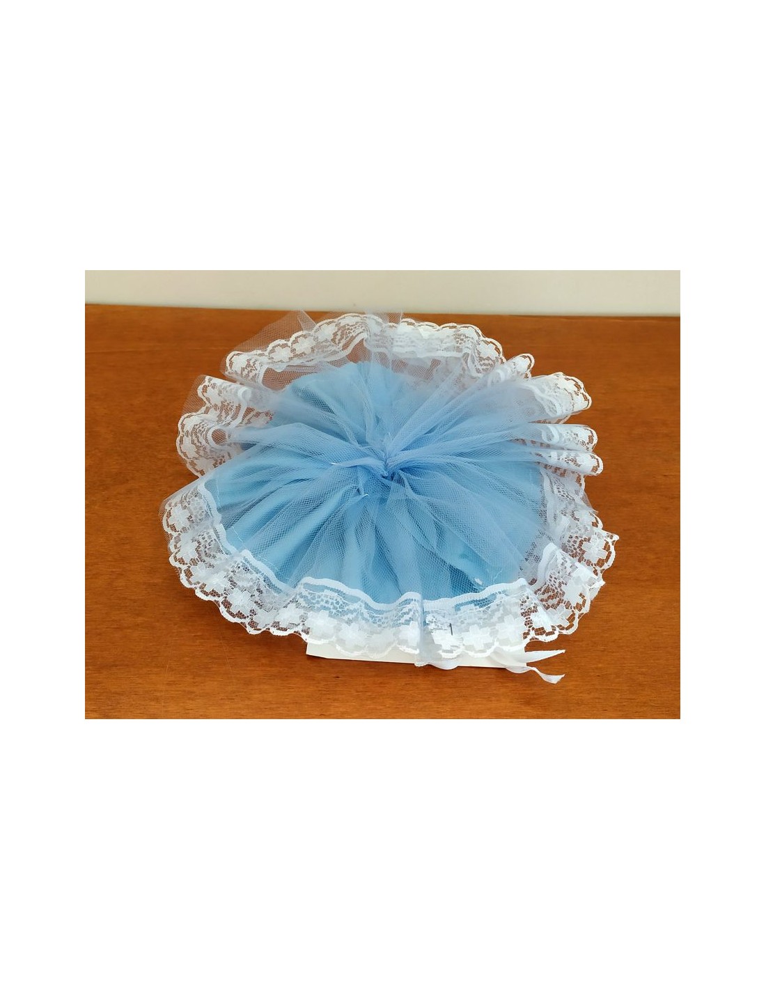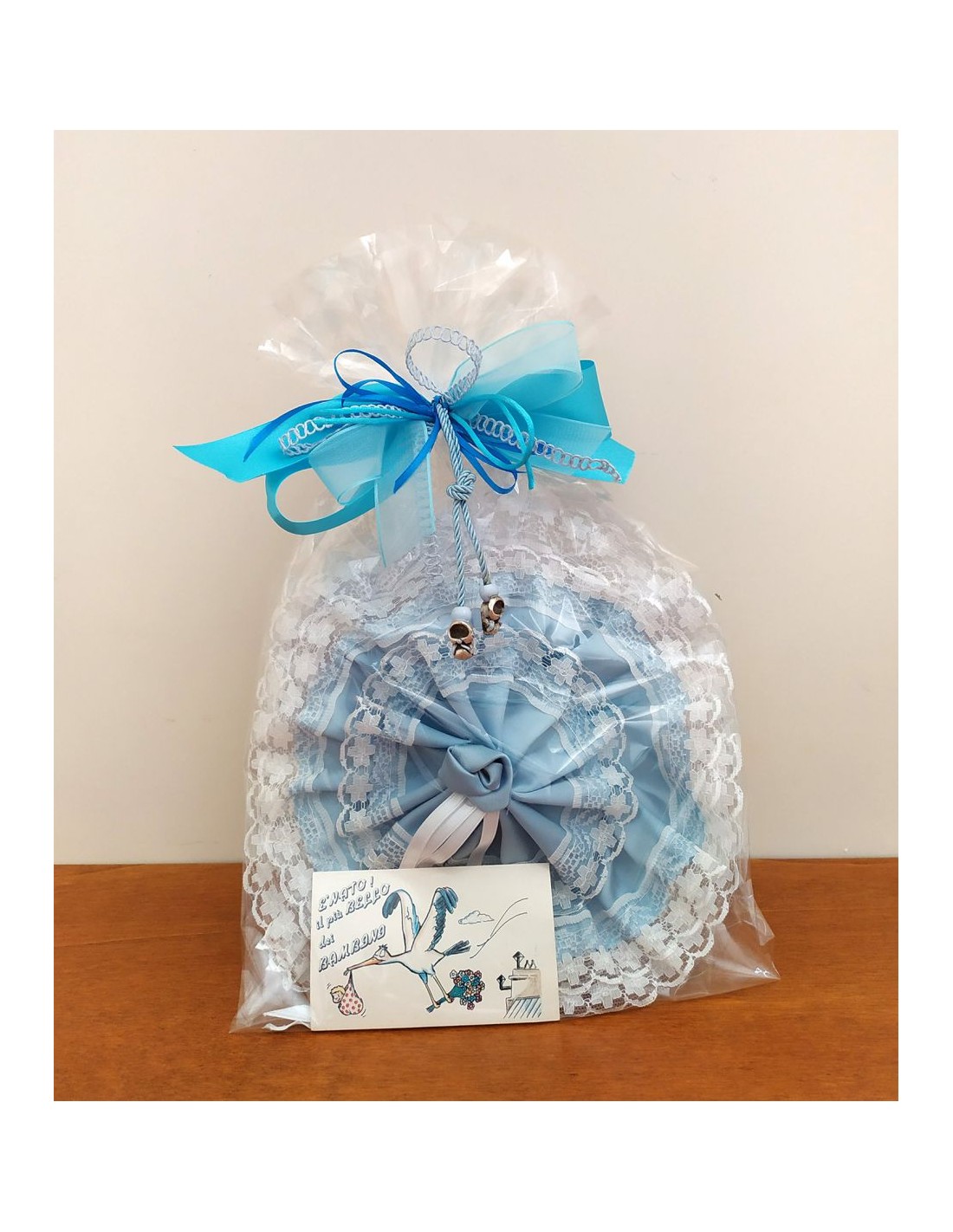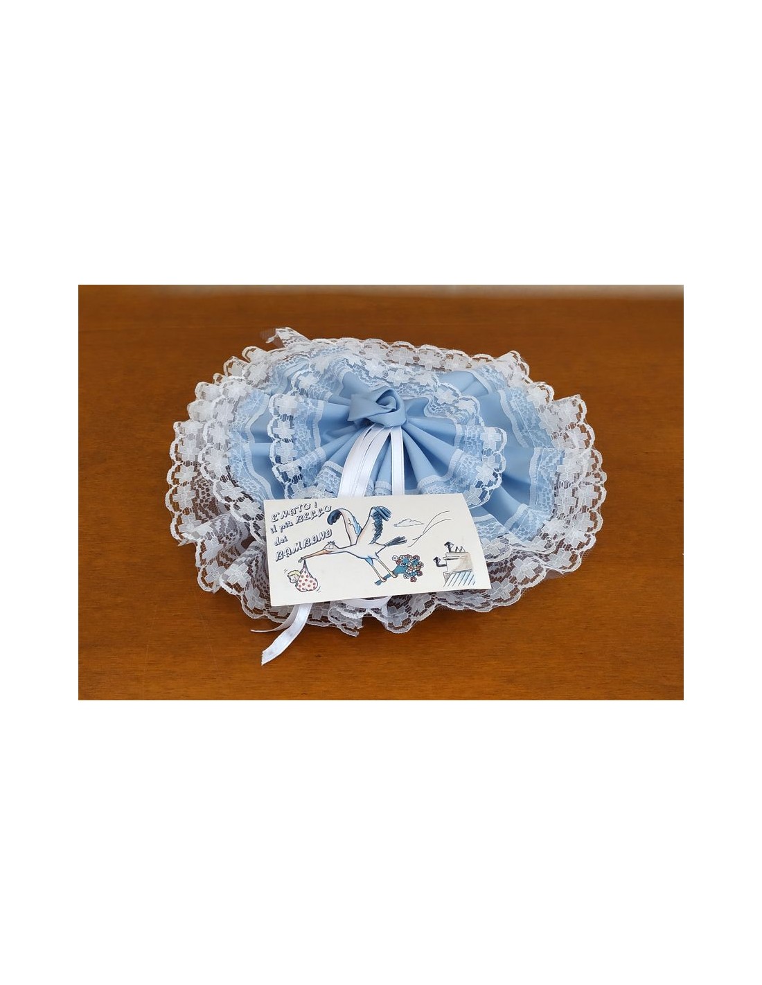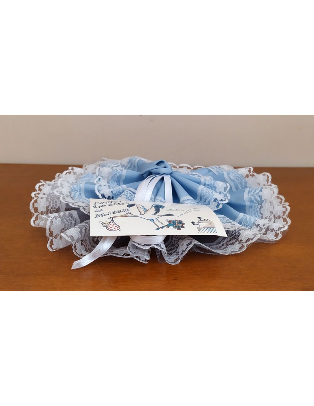 Fiocco nascita circolare, con raso celeste e pizzo panna, corredato di scarpette placcate argento con cordoncino celeste.